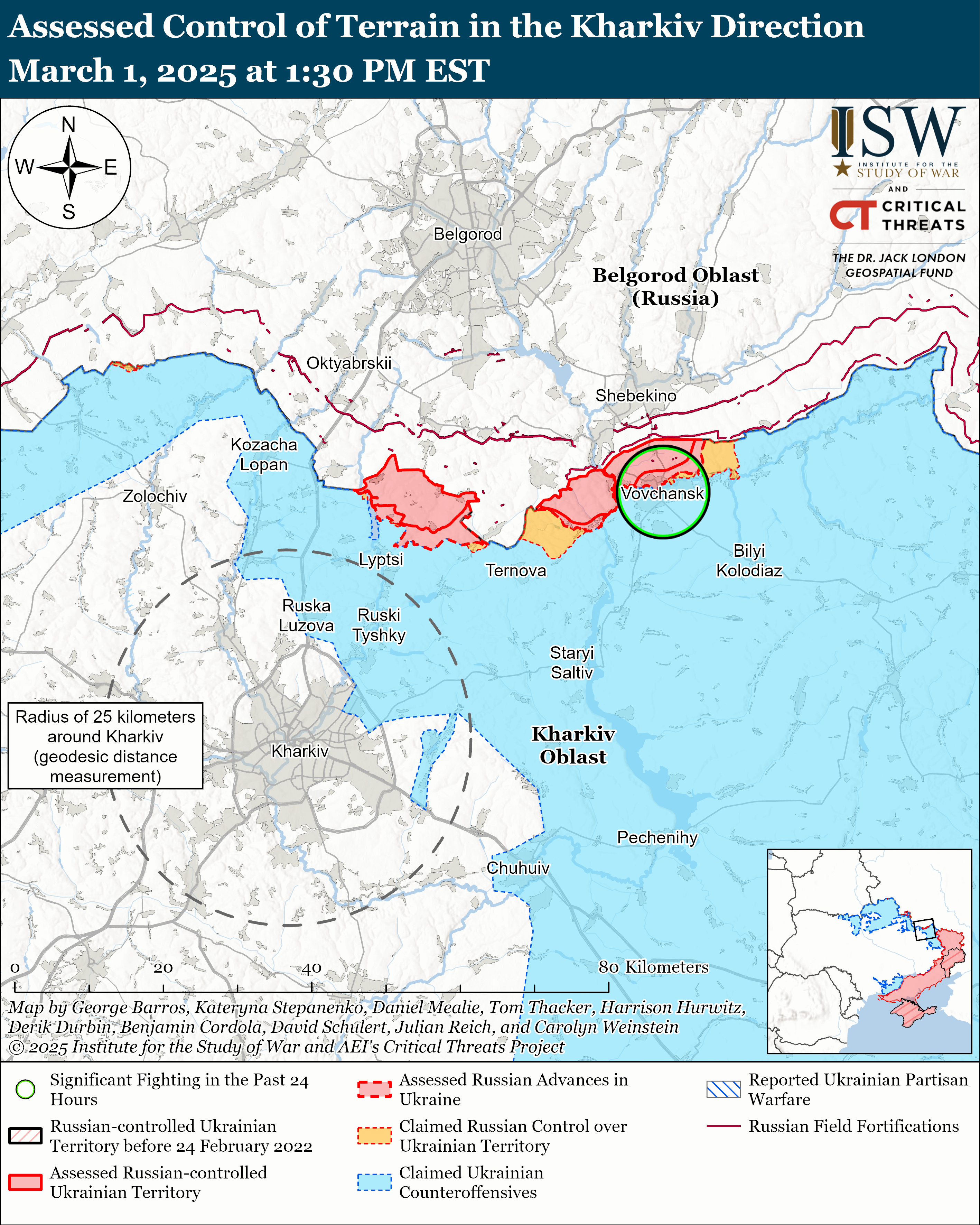 - Росіяни продовжували обмежені наземні атаки на Харківському напрямку поблизу Вовчанська 28 лютого та 1 березня, але не мали підтверджених просувань.