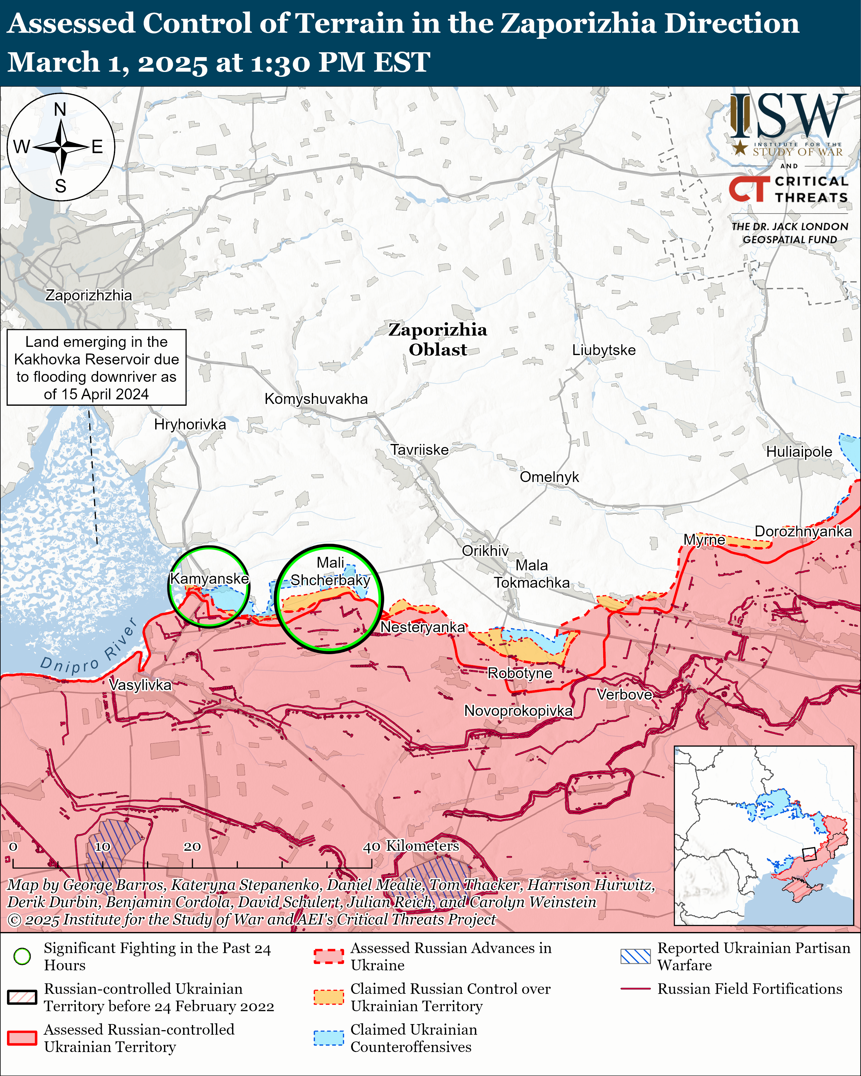 - Російська армія здійснила обмежену наземну атаку на південний захід від Гуляйполя поблизу Чарівного 1 березня, але не мала підтверджених просувань.