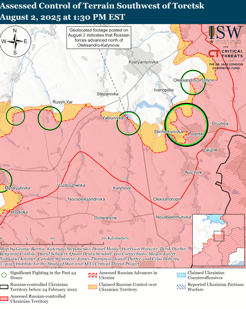 - Російські війська просунулися на Торецькому напрямку. Геолокаційні відеозаписи, опубліковані 2 серпня, свідчать про те, що загарбники нещодавно просунулися на північ від Олександро-Калинового (на північний захід від Торецька).