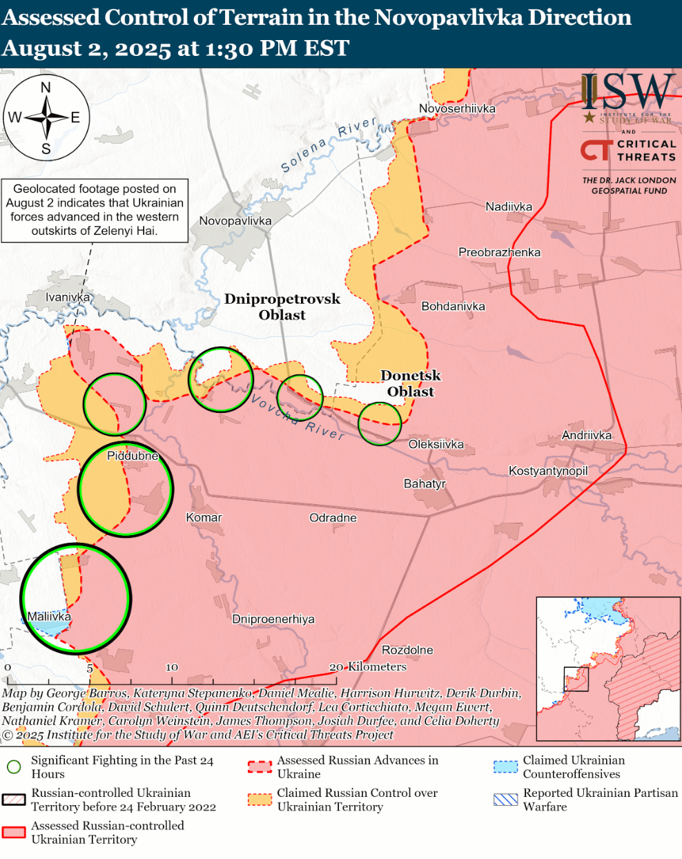 - ЗСУ просунулися на Новопавлівському напрямку. Геолокаційні відеозаписи, опубліковані 2 серпня, свідчать про те, що українські війська нещодавно просунулися на західну околицю Зеленого Гаю (на південний захід від Новопавлівки).