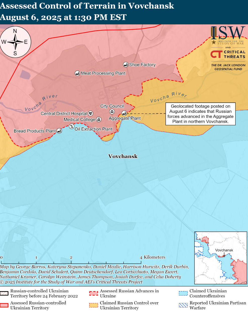 - Загарбники нещодавно просунулися на півночі Харківської області. Геолокаційні відеозаписи, опубліковані 6 серпня, свідчать про те, що російські війська нещодавно просунулися до Вовчанського агрегатного заводу на півночі Вовчанська.
