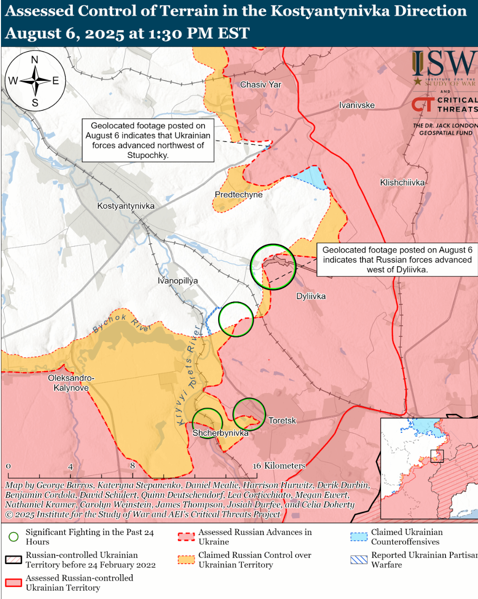 - Російські війська нещодавно просунулися на Торецькому напрямку. Геолокаційні відеозаписи, опубліковані 6 серпня, свідчать про те, що російські війська просувалися на захід від Диліївки (на північ від Торецька).