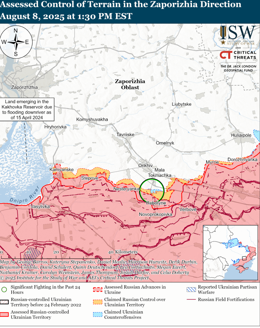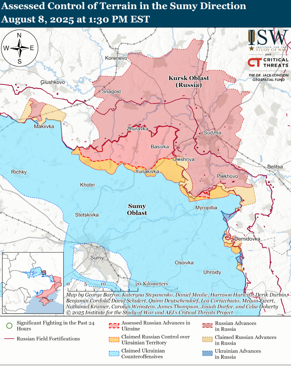 - Російські війська 7 та 8 серпня продовжували наступальні операції у невизначених районах Курської області, але не просувалися вперед.