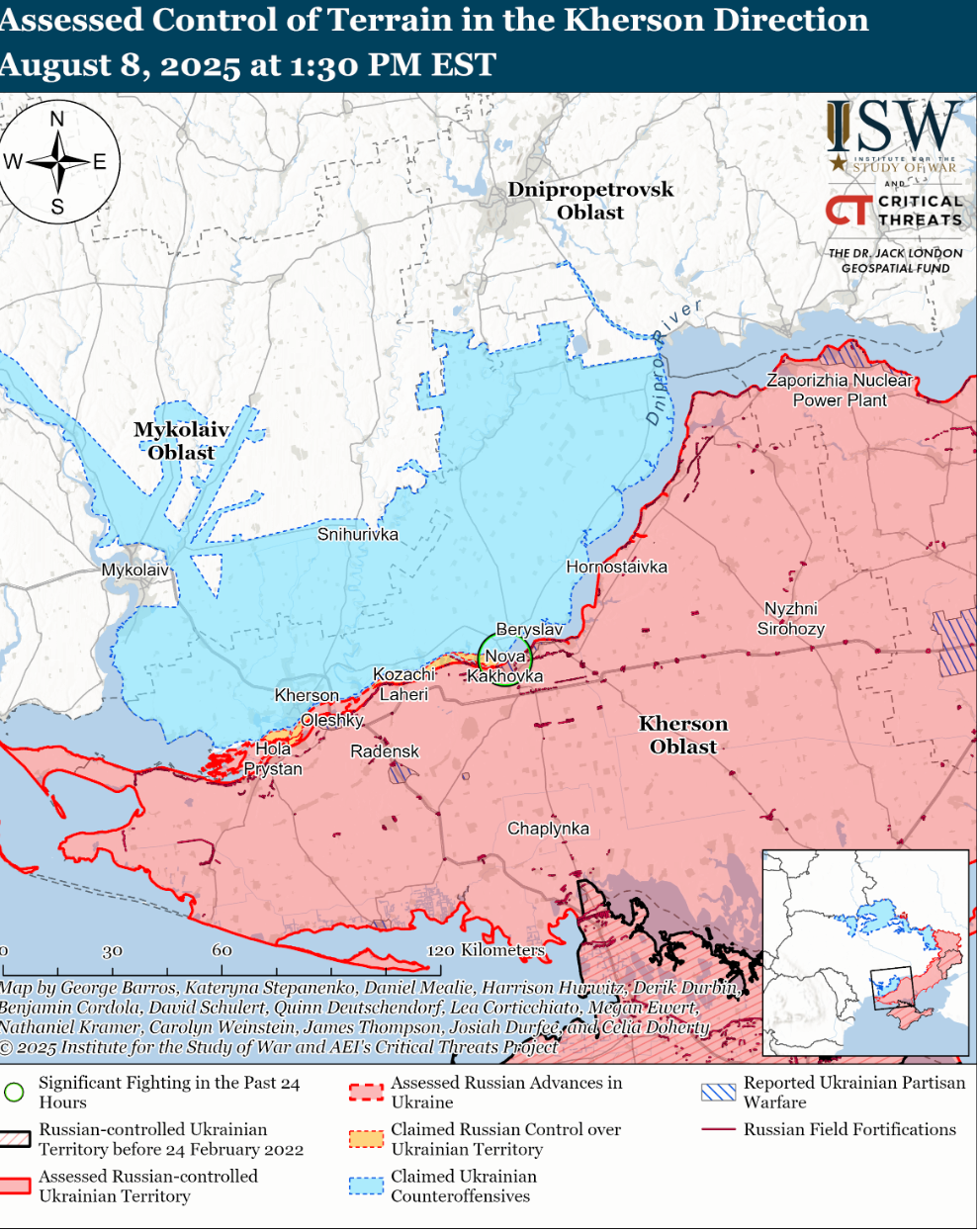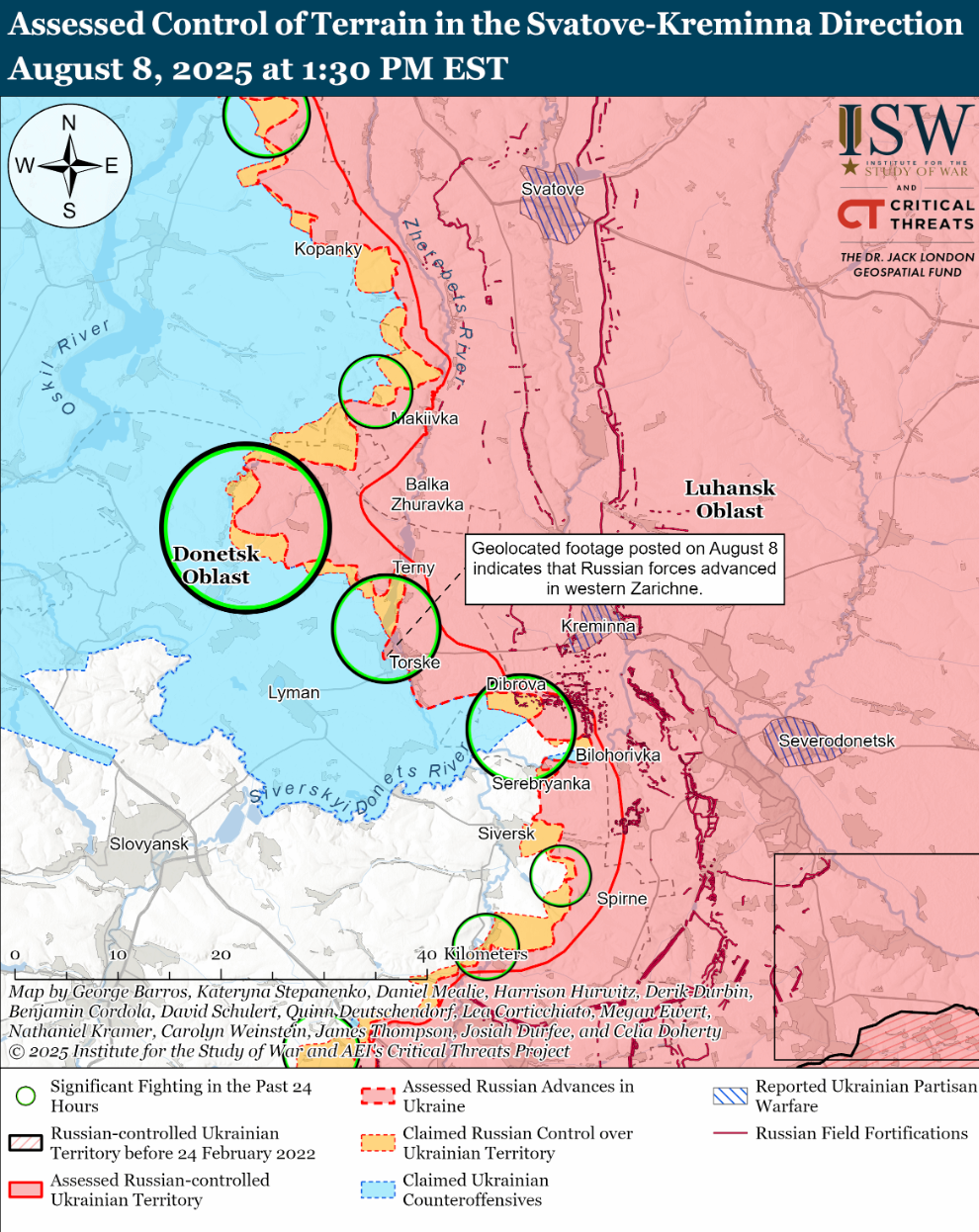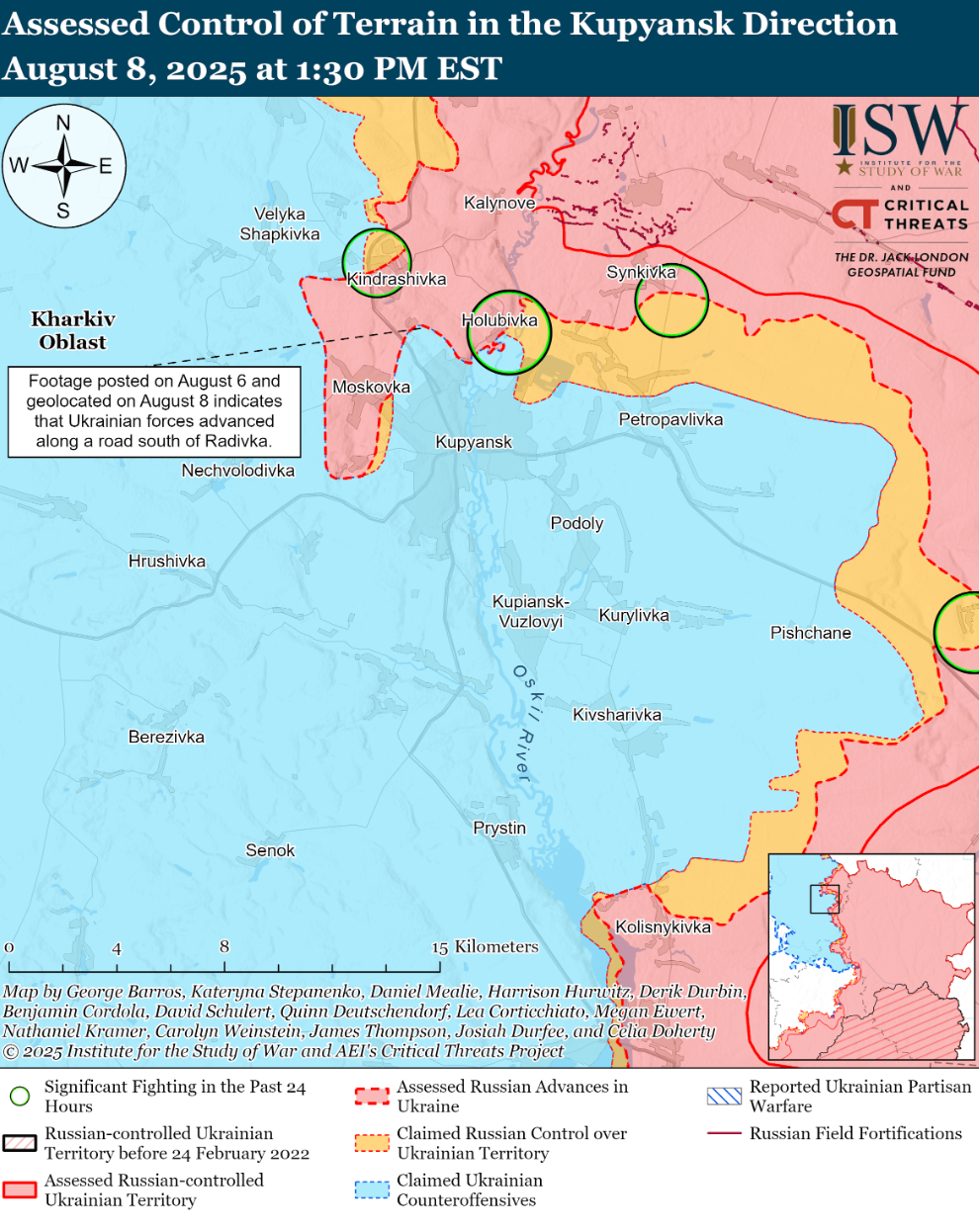 - Сили оборони України нещодавно просунулися на Куп'янському напрямку. Геолокаційні відеозаписи, опубліковані 6 серпня, свідчать про те, що українські війська нещодавно просунулися на південний захід від Радьківки (на північ від Куп'янська).