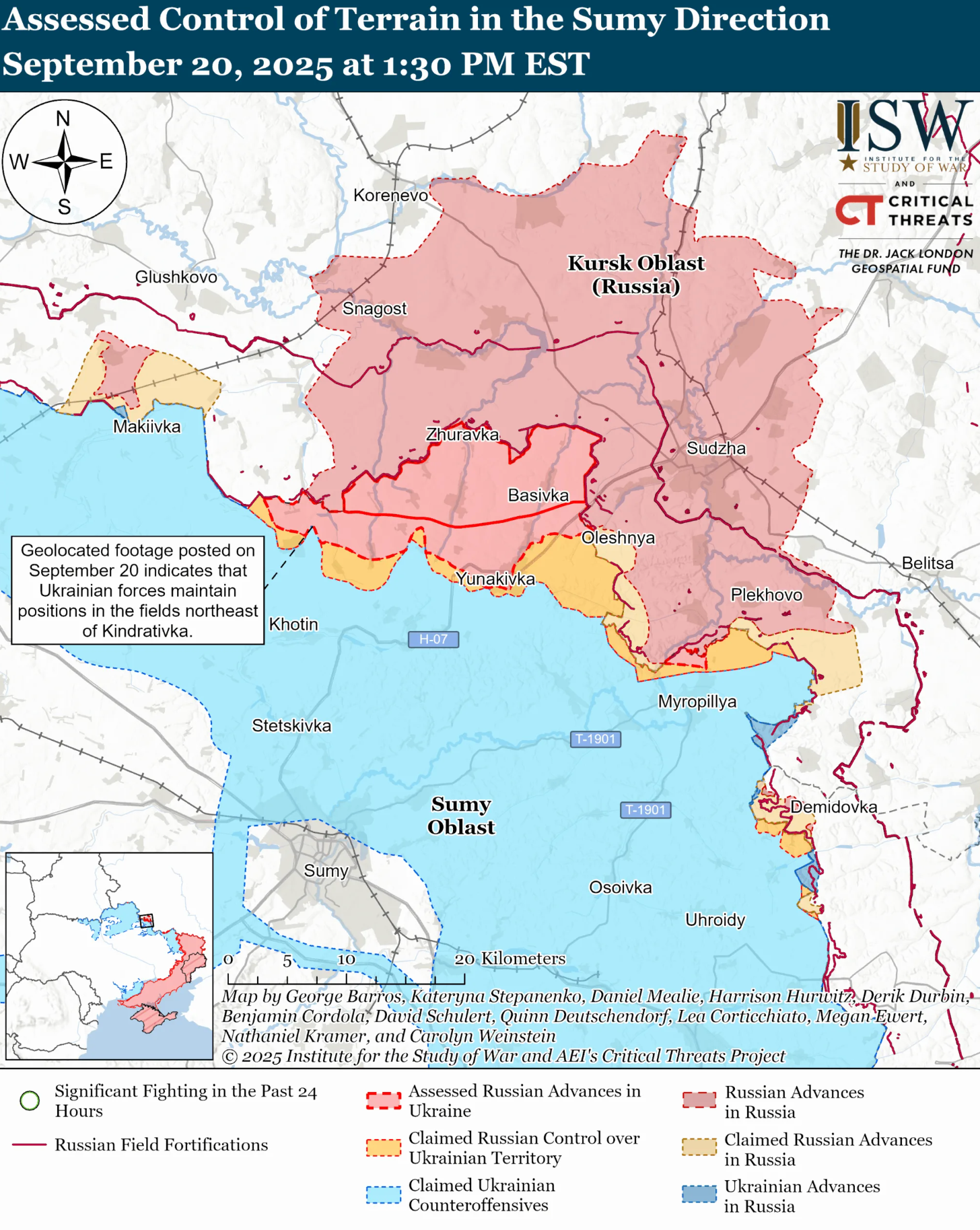 - ЗСУ нещодавно просунулися на півночі Сумської області. Геолокаційні відеозаписи, опубліковані 20 вересня, свідчать про те, що українські війська просунулися на північний схід від Кіндратівки (на північ від міста Суми).