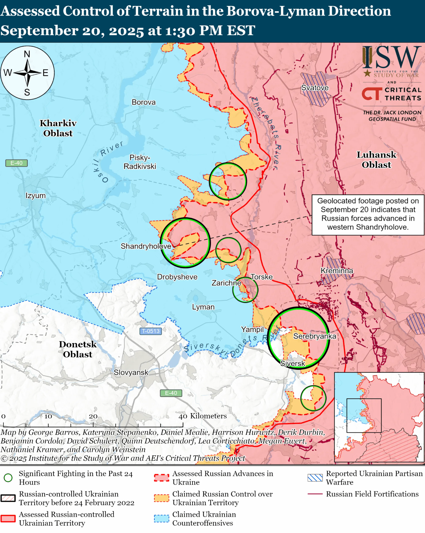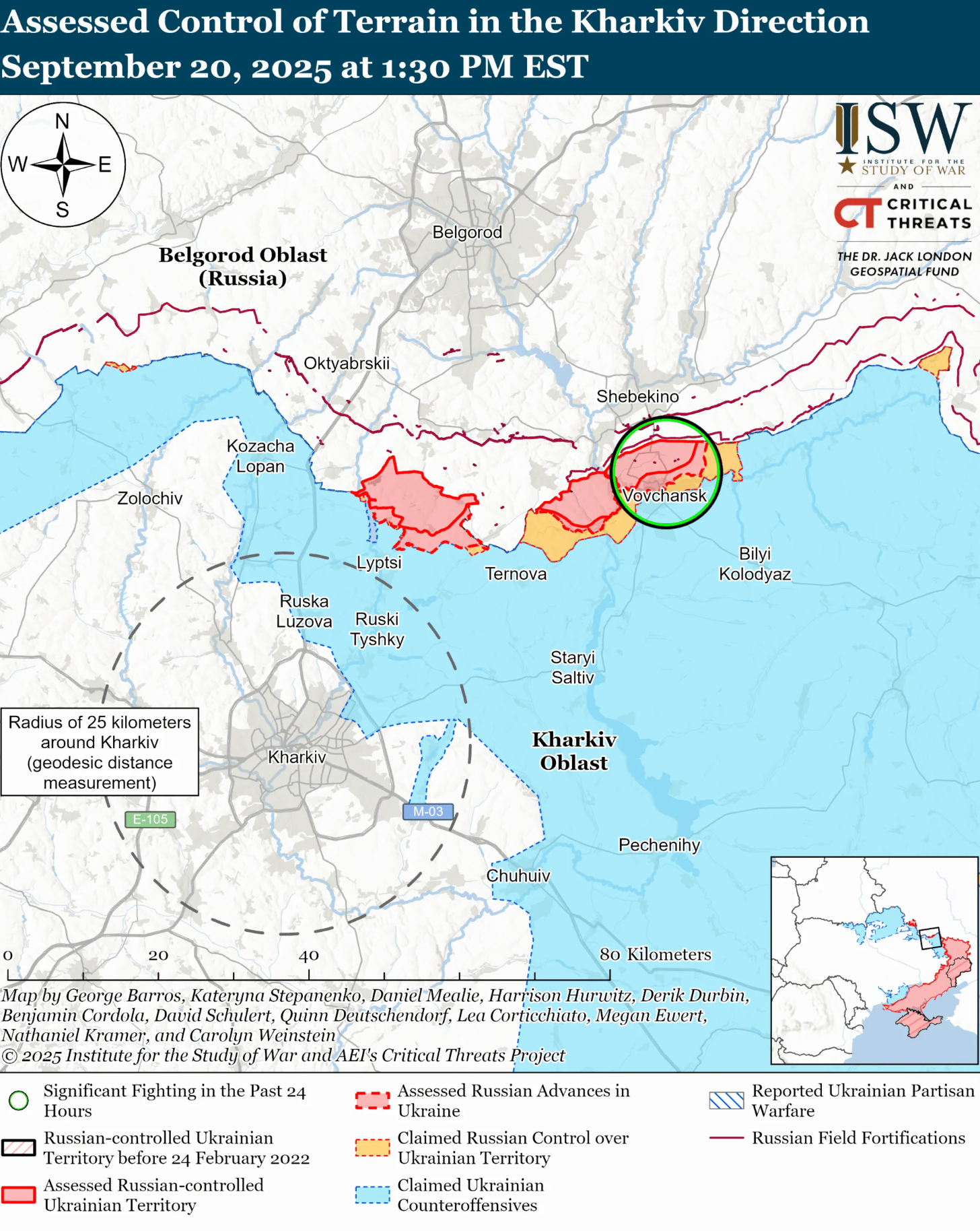 - Водночас російські війська нещодавно просунулися на півночі Харківської області. Геолокаційні відеозаписи, опубліковані 20 вересня, вказують на те, що окупанти просунулися до Вовчанського нафтоекстракційного заводу у західному Вовчанську (на північний схід від Харкова).
