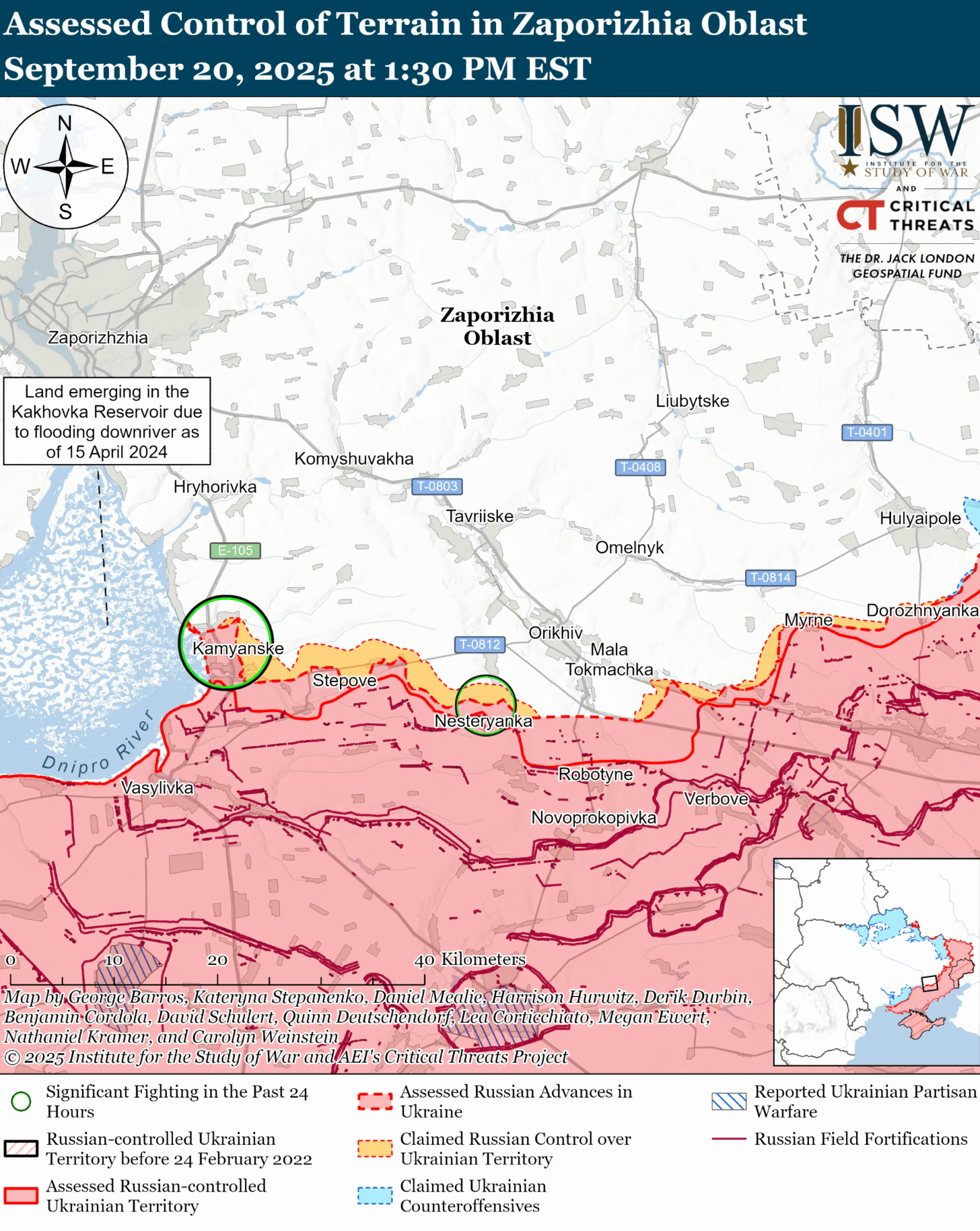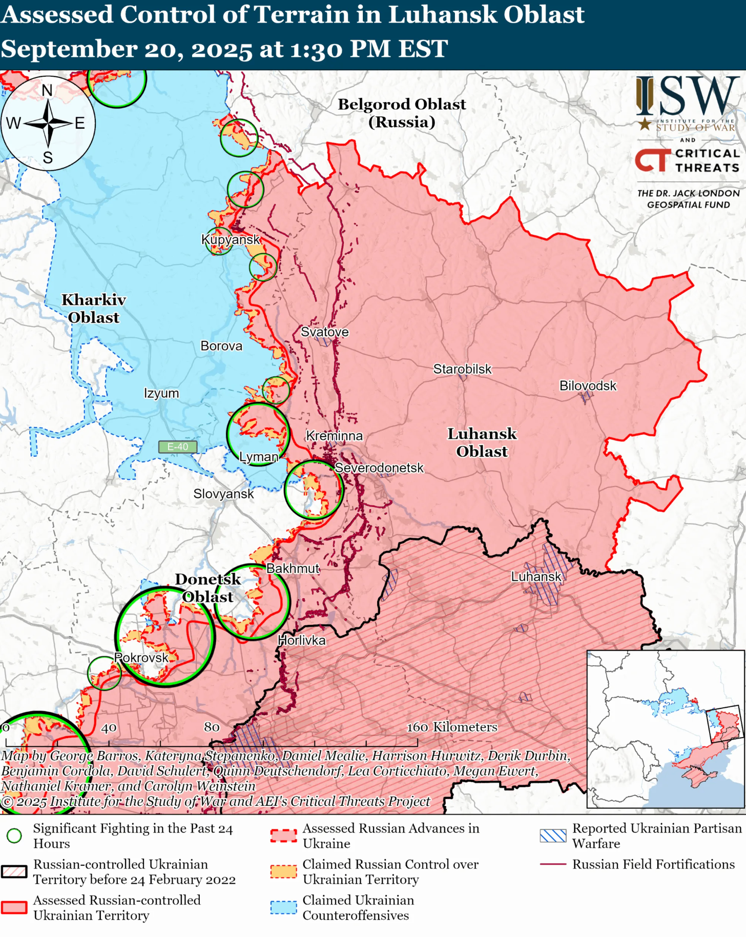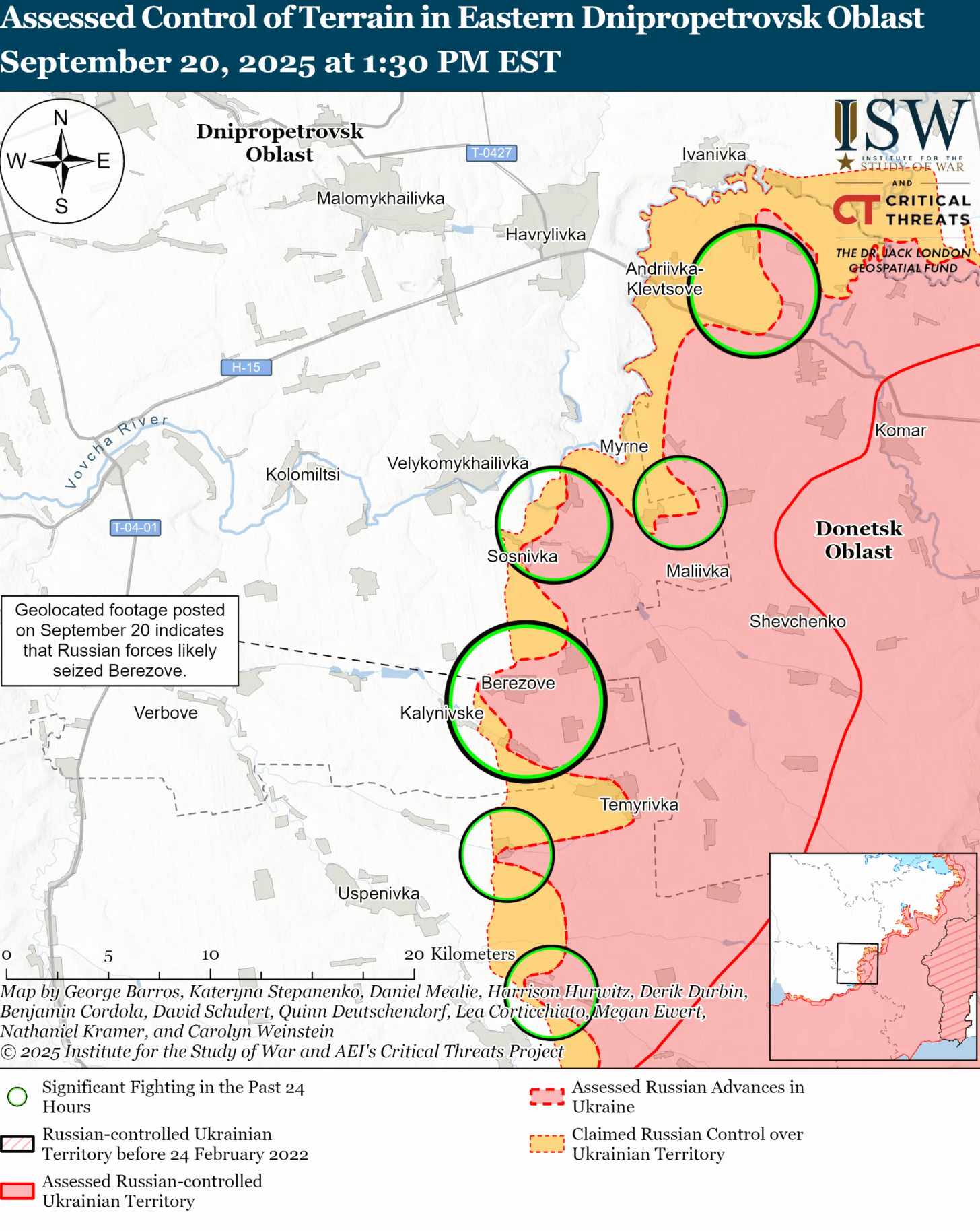 - Українські та російські війська нещодавно просунулися на Покровському напрямку. Аналітики пишуть, що 19 та 20 вересня російські мілблогери визнали, що українські війська просунулися до північної околиці Новоторецького та на захід від Бойківки (обидва на північний схід від Покровська). Також геолокаційні відеозаписи, опубліковані 19 вересня, свідчать про те, що російські загарбники нещодавно просунулися у західній частині Новоекономічного (на північний схід від Покровська).