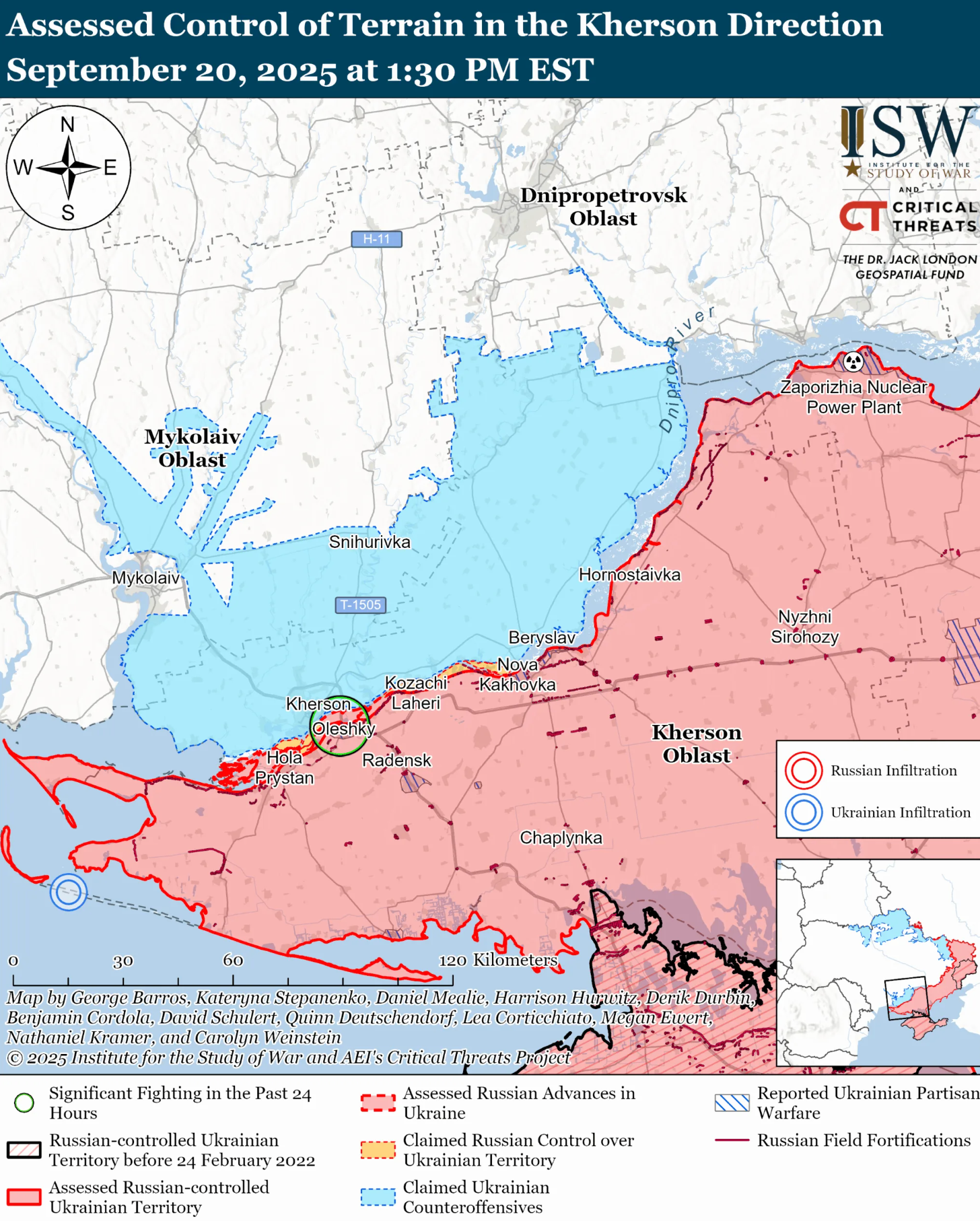 - Днями російські війська продовжували наступ на Херсонському напрямку, зокрема поблизу Антонівського залізничного та автомобільного мостів (на схід від Херсона).