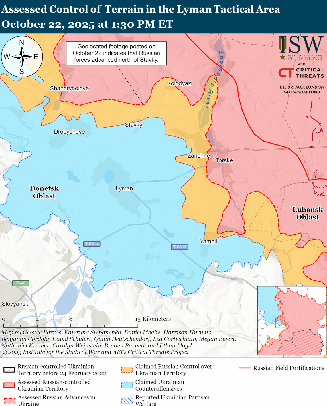 Російські війська нещодавно просунулися на Лиманському напрямку. Вказується, що геолокаційні відеозаписи, опубліковані 21 жовтня, показують, як ЗСУ атакували російський бронетранспортер БТР-82А на північ від Ставок (на північ від Лимана) під час російського механізованого наступу 20 жовтня, що свідчить про те, що армія противника просувалася на північ від населеного пункту під час штурму.