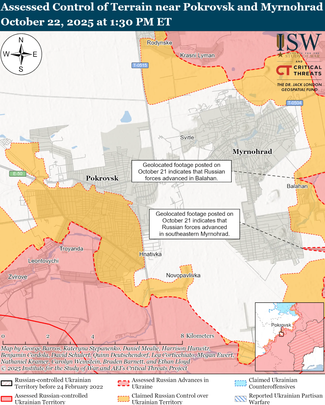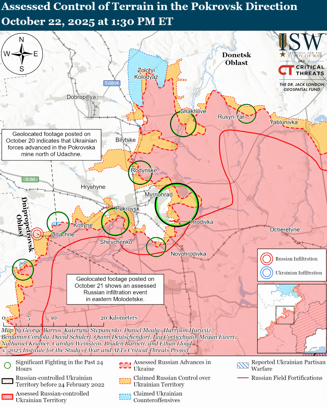 Проте російські війська нещодавно просунулися в районі Покровська. Геолокаційні відеозаписи, опубліковані 22 жовтня, свідчать про те, що окупанти нещодавно просунулися на південний схід Мирнограда (на схід від Покровська) під час механізованого штурму.