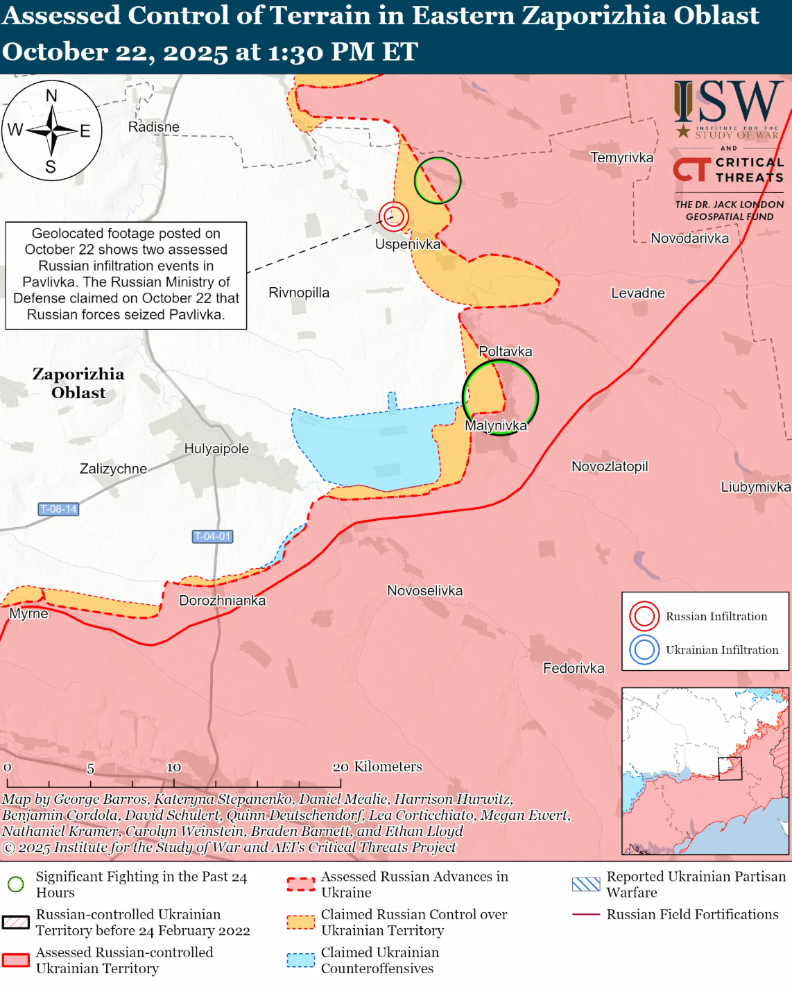 Російські загарбники активізувалися на Півдні України, провівши механізовані штурмові дії. Протягом дня 20 жовтня окупанти провели ряд штурмових дій по відтинку Щербаки – Нестерянка – Роботине – Новопокровка – Мала Токмачка, використовуючи різноманітну техніку. Більшість техніки було уражено ще до її підходу до лінії бойового зіткнення, але після підбиття техніки, штурмові дії продовжувала здійснювати піхота.