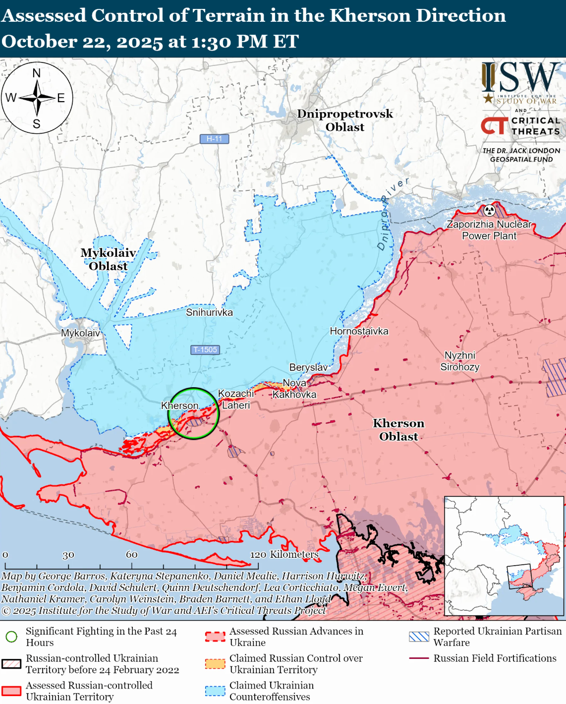 Вороже військо продовжувало обмежені наземні наступи на Херсонському напрямку, зокрема на схід від міста Херсон поблизу Антонівського мосту.