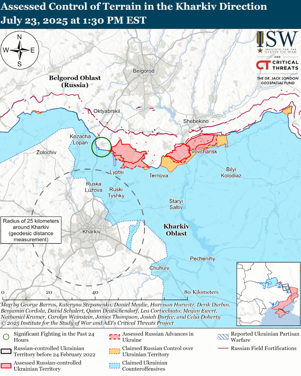 - 23 липня окупанти продовжили наступальні операції на півночі Харківської області, але підтвердженого прогресу не досягли.