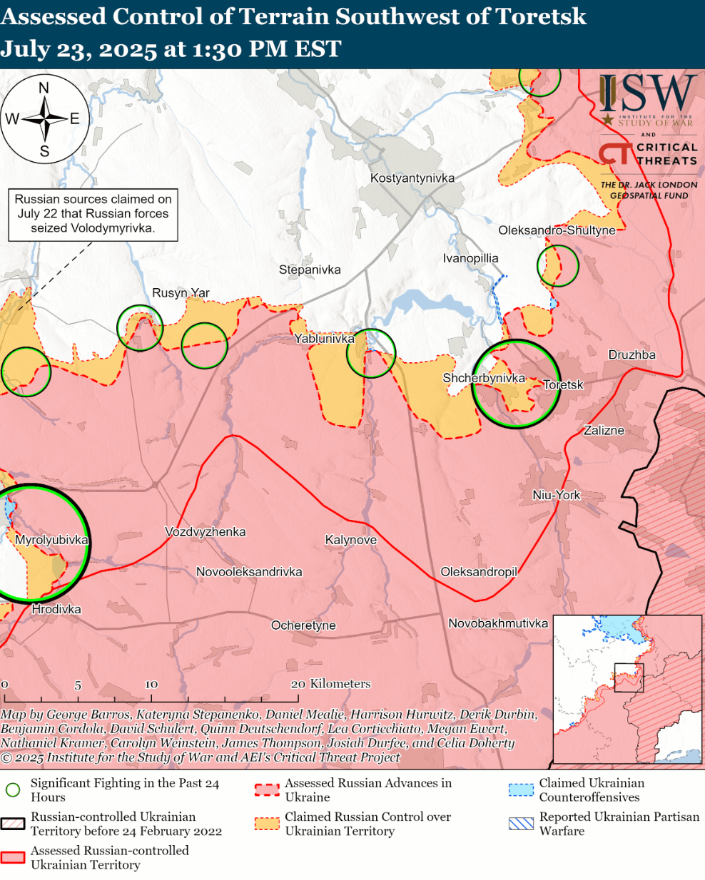 - Українські війська нещодавно просунулися в напрямку Часів Яр. Геолокаційні відеозаписи, опубліковані 22 липня, свідчать про те, що ЗСУ нещодавно просунулися вздовж вулиці Злагоди на південному заході Часів Яр.