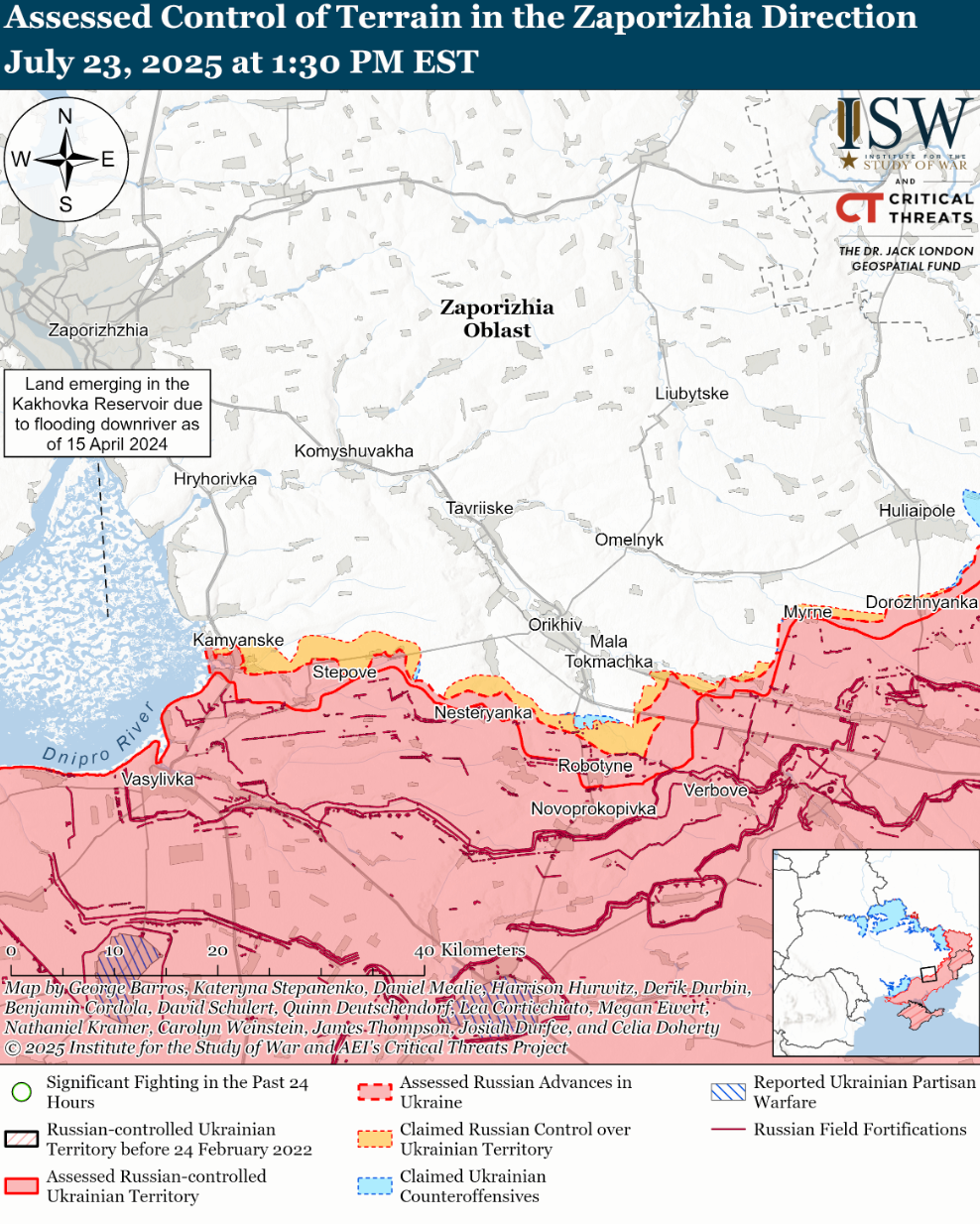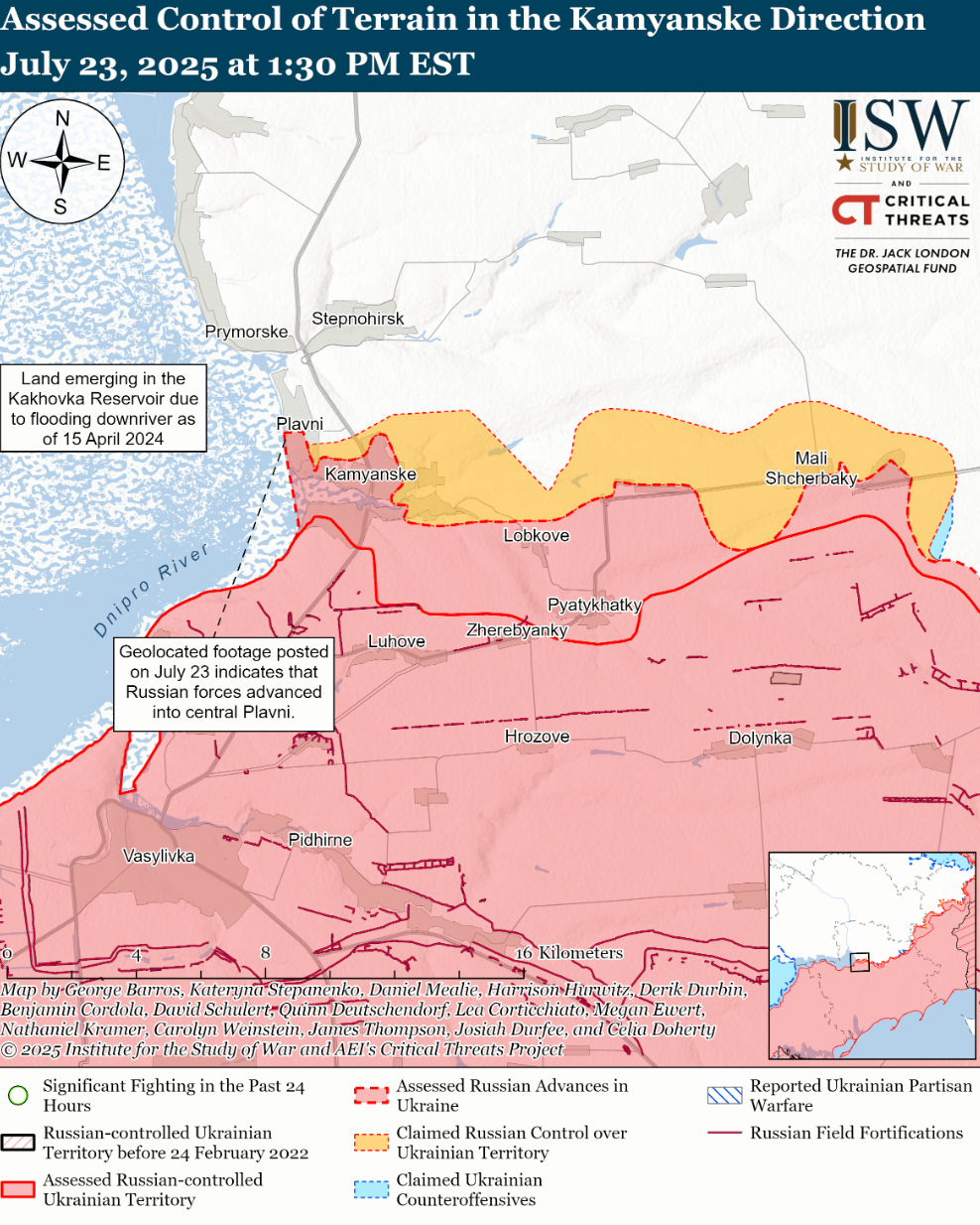 - Російські війська нещодавно просунулися на захід Запорізької області. Геолокаційні відеозаписи, опубліковані 23 липня, свідчать про те, що російські війська нещодавно просунулися в центральній частині Плавнів (на захід від Оріхова).