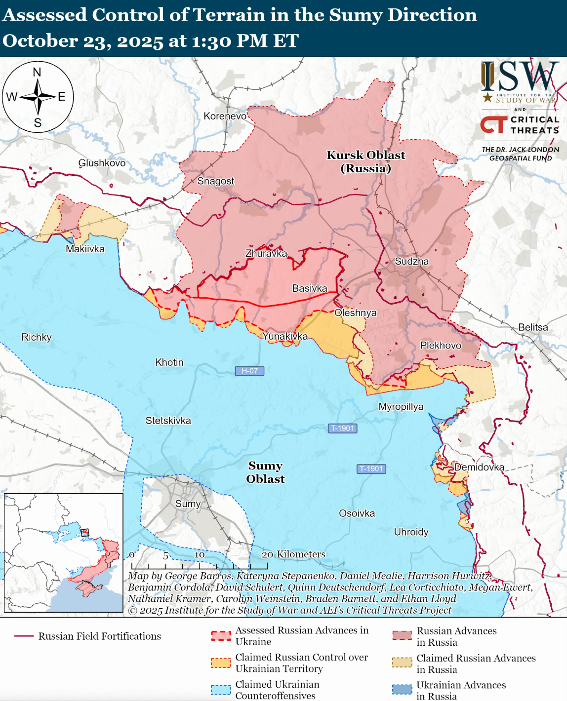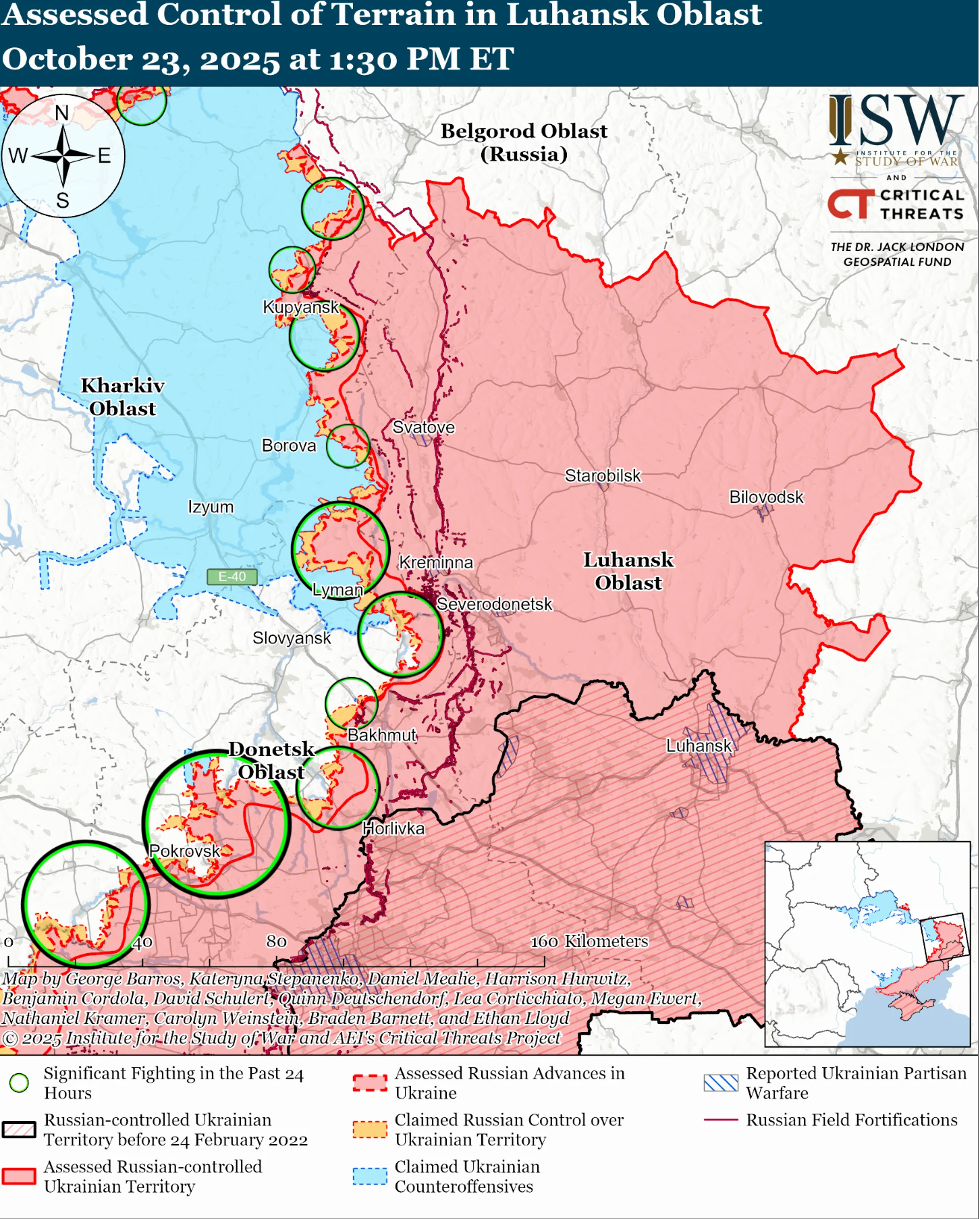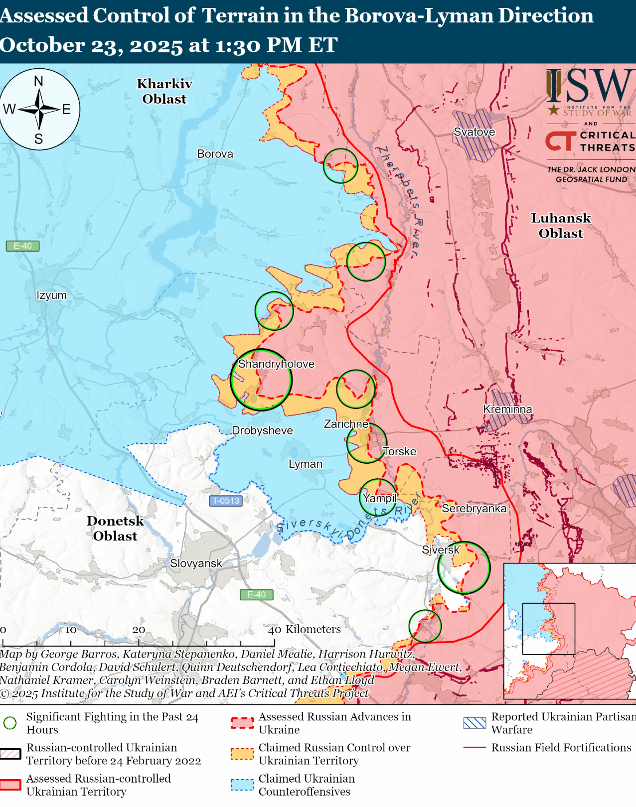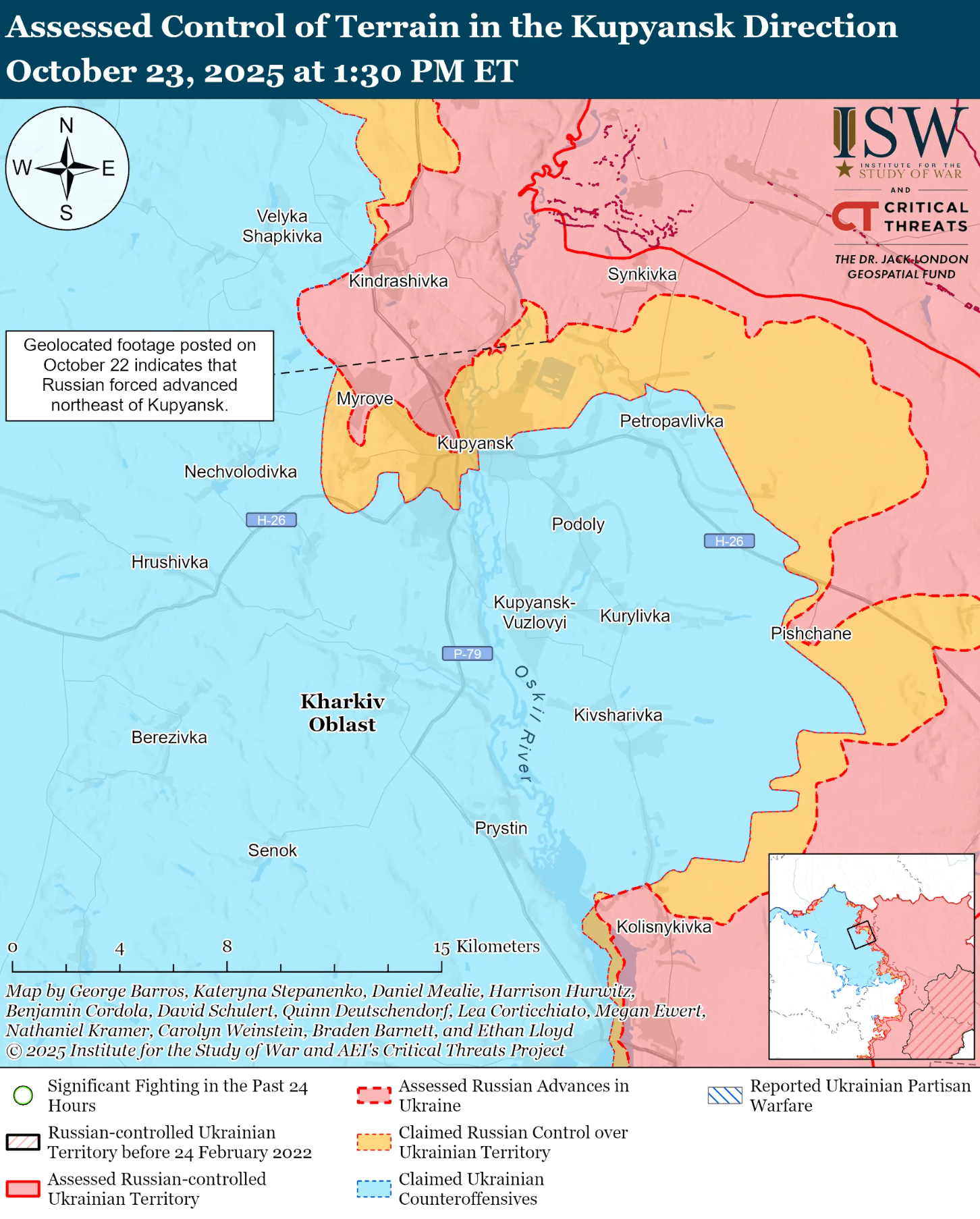 Армія Кремля просунулася в районі Куп'янська. Геолокаційні відеозаписи, опубліковані 22 жовтня, свідчать про те, що російські війська нещодавно просунулися на північ від Куп'янська вздовж Південної залізниці та у західній Дворічній (на північний схід від Куп'янська).