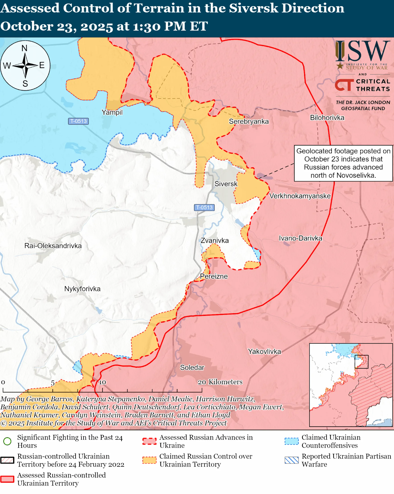 Російські війська нещодавно просунулися в районі Сіверська. Відповідно до геолокаційних відеозаписів 23 жовтня, російські війська просунулися на схід від Сіверська під час механізованого штурму.