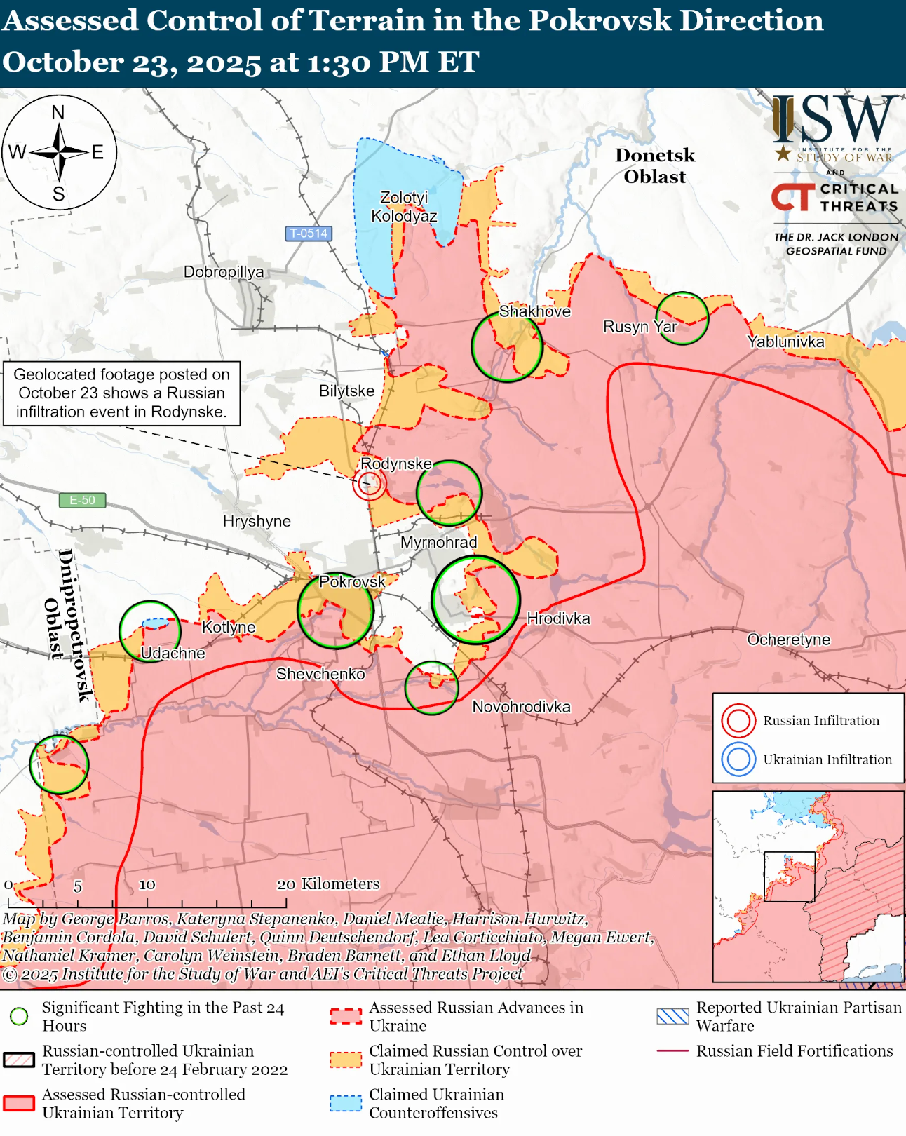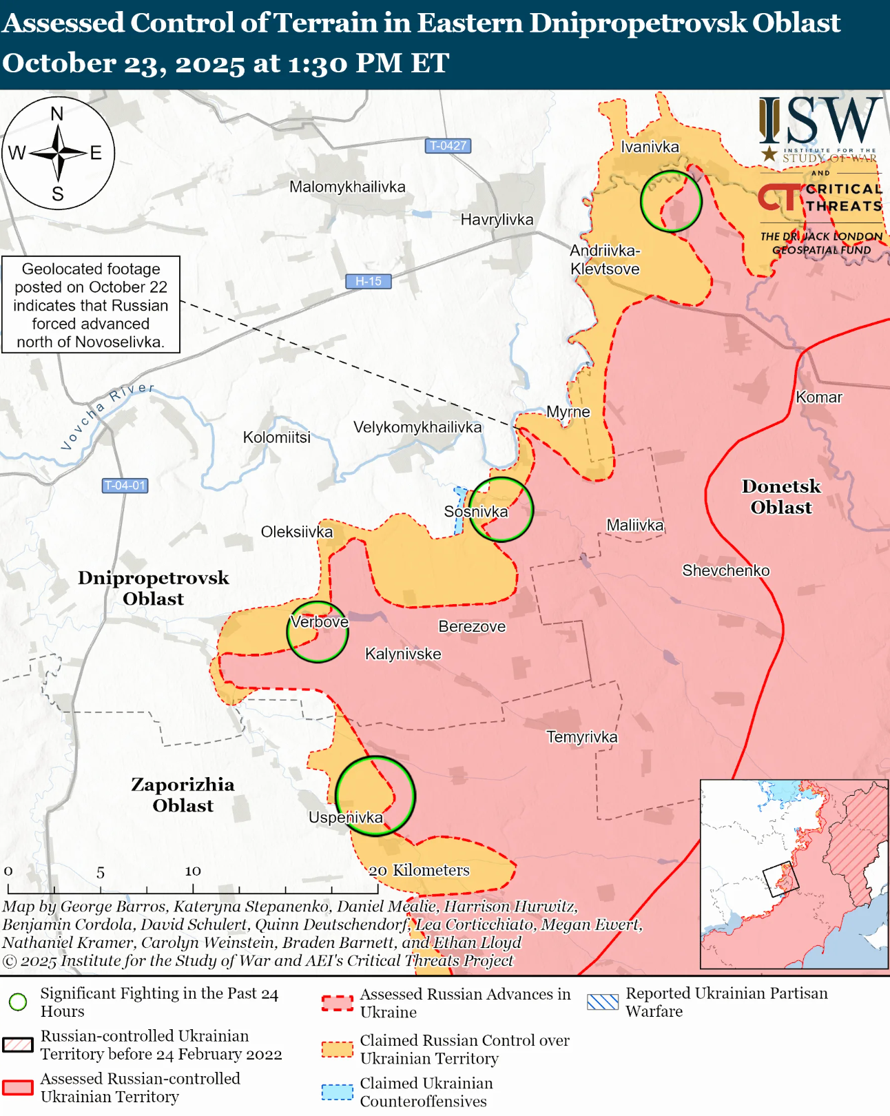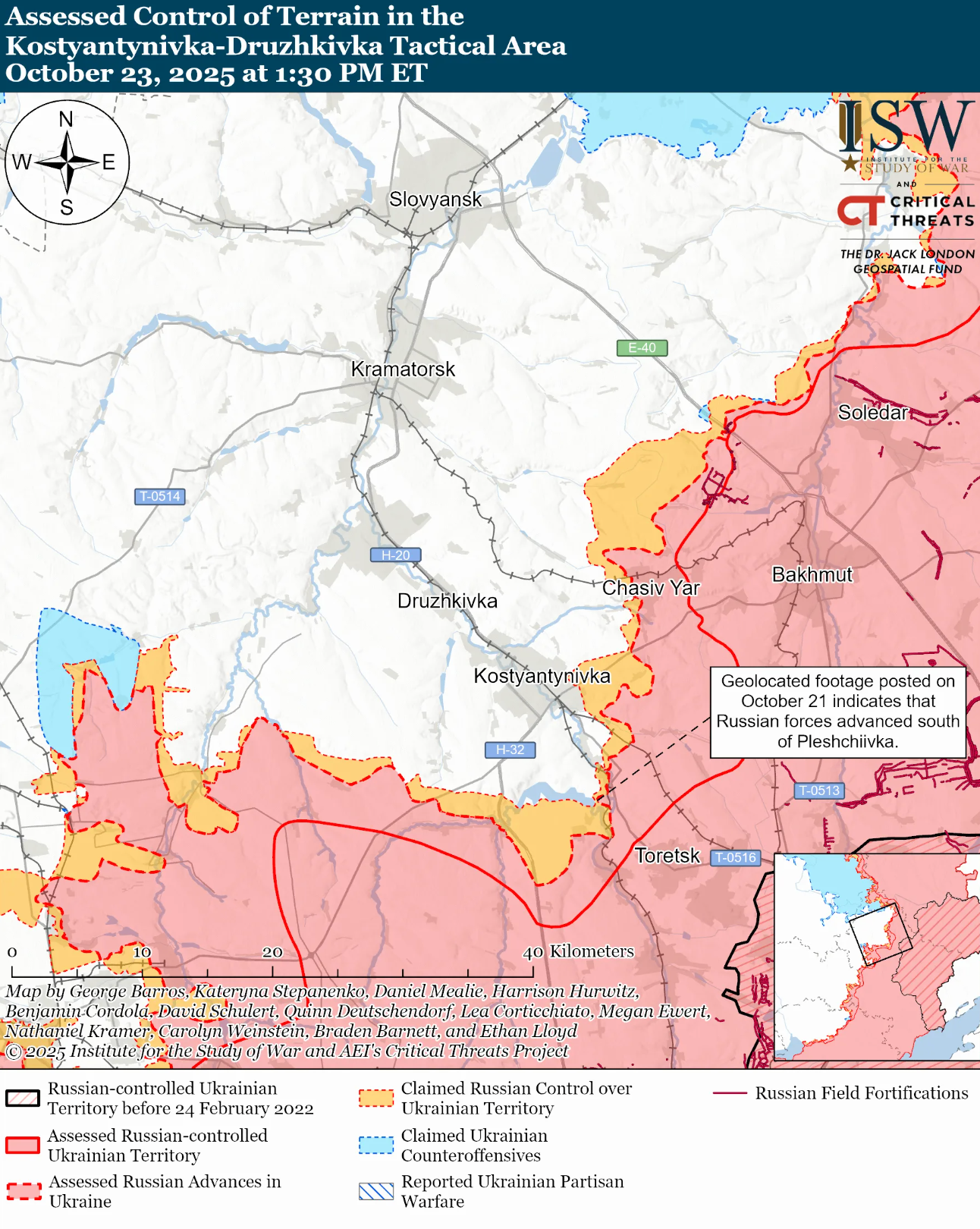 Армія Кремля нещодавно просунулася і в тактичному районі Костянтинівка-Дружківка. Геолокаційні кадри свідчать про те, що російські війська просунулися на північ від Щербинівки (на південний схід від Костянтинівки).