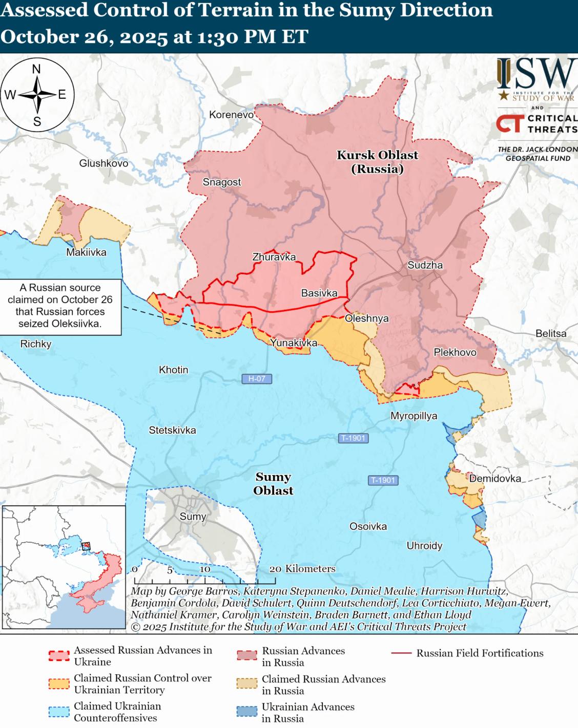Російські війська 25 та 26 жовтня атакували в Курській і Сумській областях, зокрема на північ від міста Суми поблизу Кіндратівки та Костянтинівки, а також на північний схід від міста Суми поблизу Юнаківки та Олексіївки. Загалом окупанти продовжили наступальні операції на півночі Сумської області, але підтвердженого прогресу не досягли.