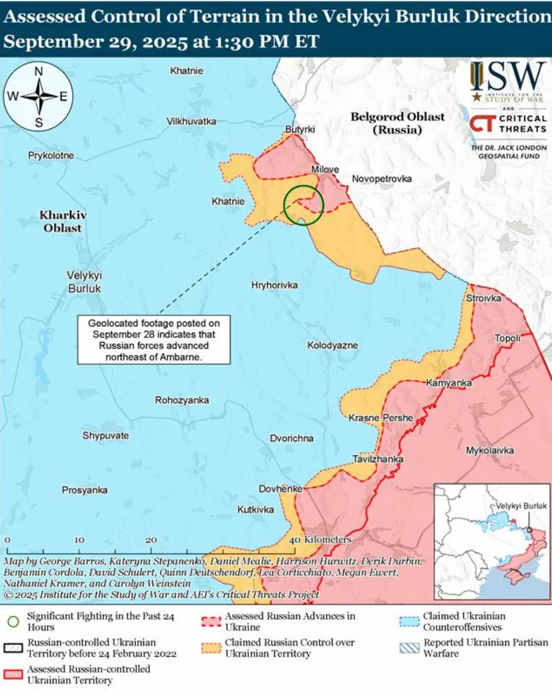 Водночас російські війська нещодавно просунулися у напрямку Великого Бурлука. Геолокаційні відеозаписи, опубліковані 28 вересня, свідчать про те, що окупанти нещодавно просунулися на північний схід від Амбарне (на північний схід від Великого Бурлука).