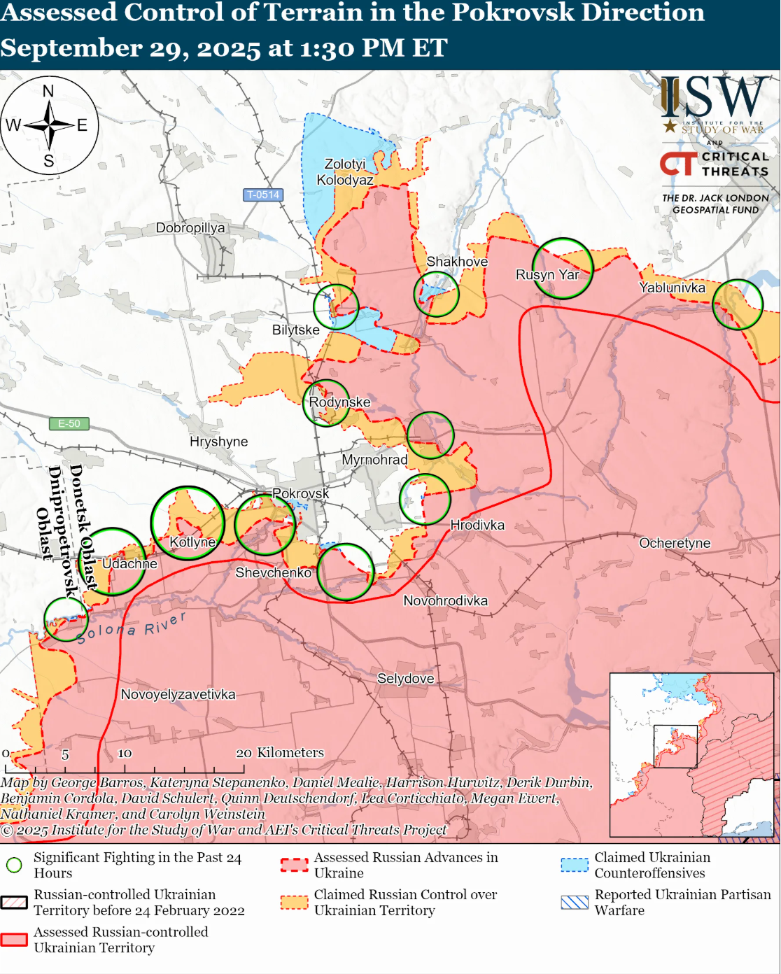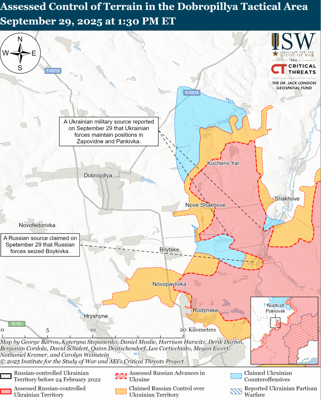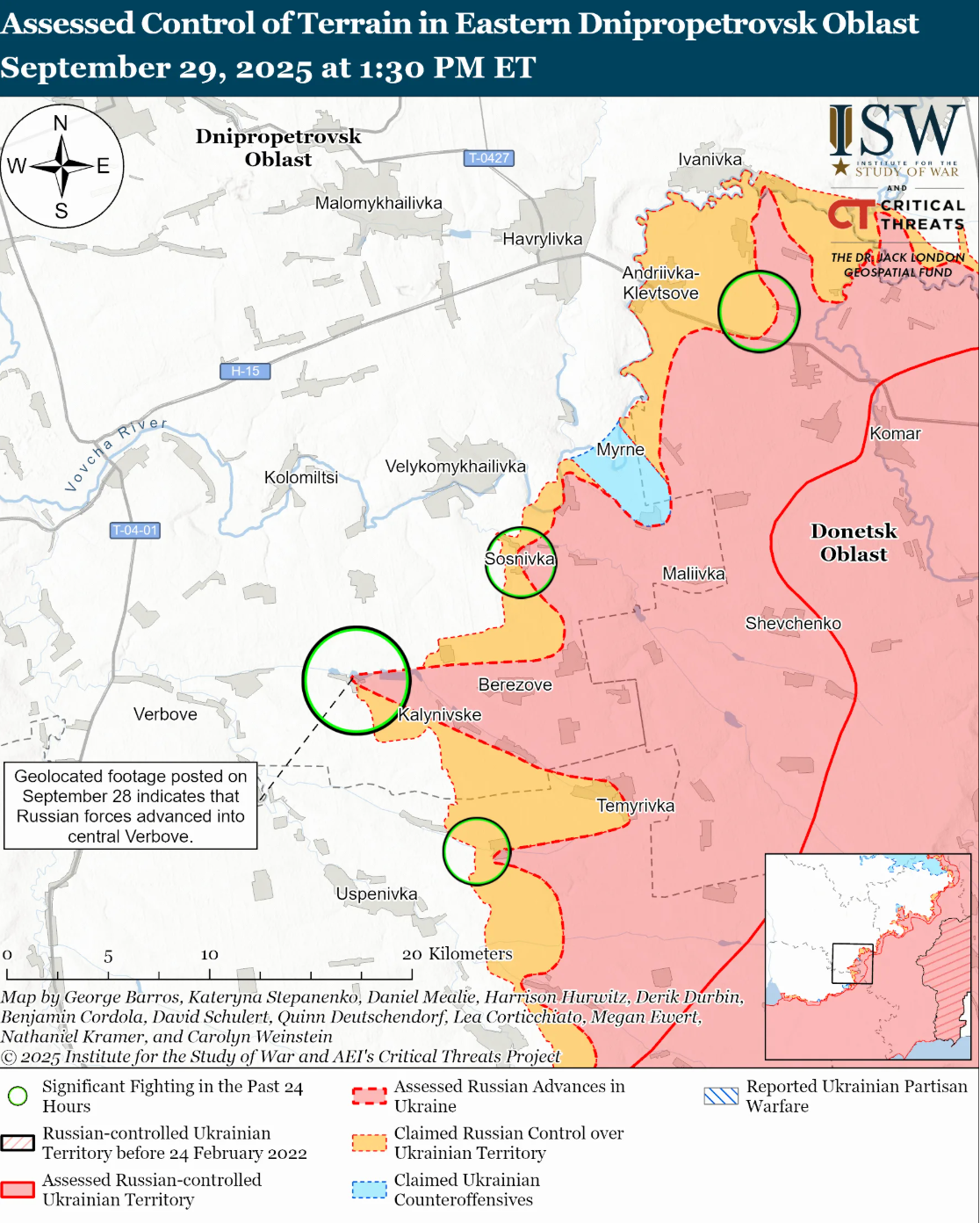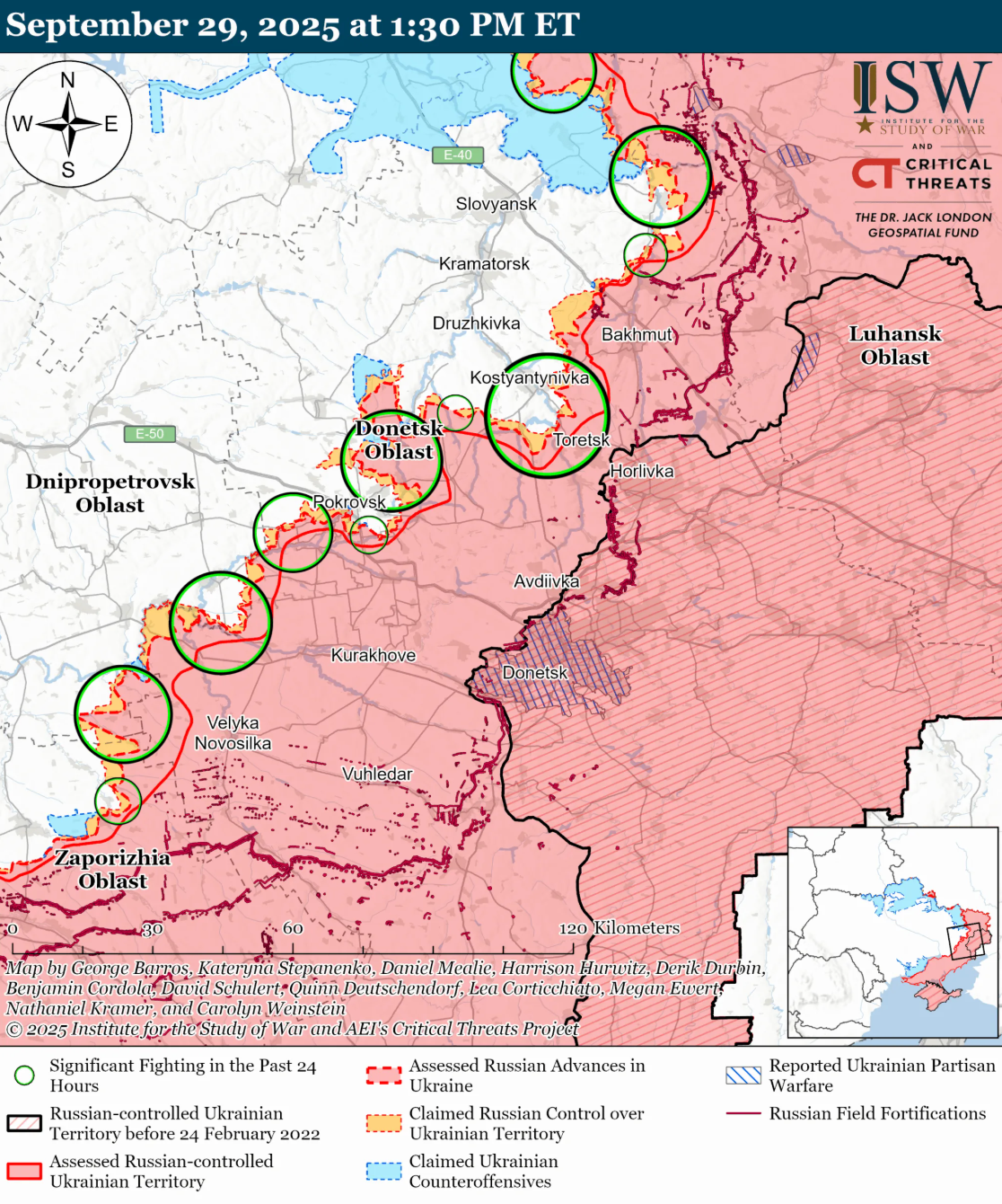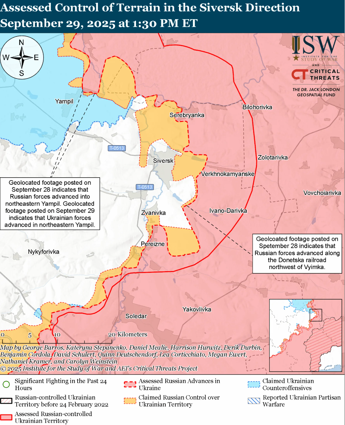 За даними аналітиків, українські та російські війська нещодавно просунулися на Лиманському напрямку. Геолокаційні відеозаписи, опубліковані 29 вересня, свідчать про те, що ЗСУ просунулися на північний схід від Ямполя (на південний схід від Лимана). Також геолокаційні відеозаписи показують, що кремлівські війська нещодавно просунулися на північний схід від Ямполя та на північ від Шандриголового (на північний захід від Лимана).