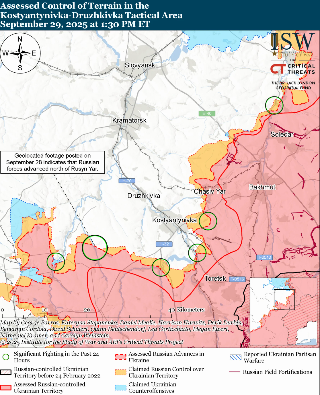 Армія противника просунулася в тактичному районі Костянтинівка-Дружківка. Відповідно до геолокаційних відеозаписів, російські війська нещодавно просунулися на північний захід від Русин Яр (на південь від Дружківки)