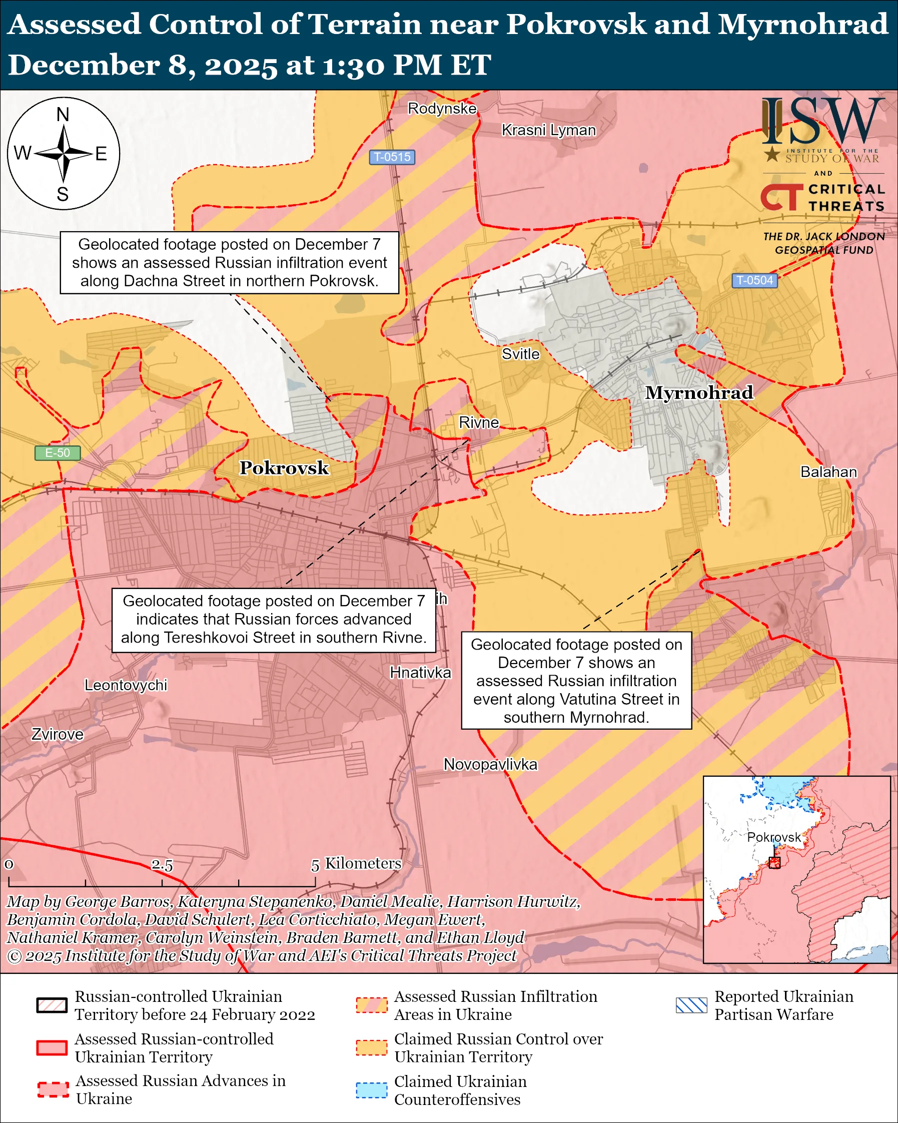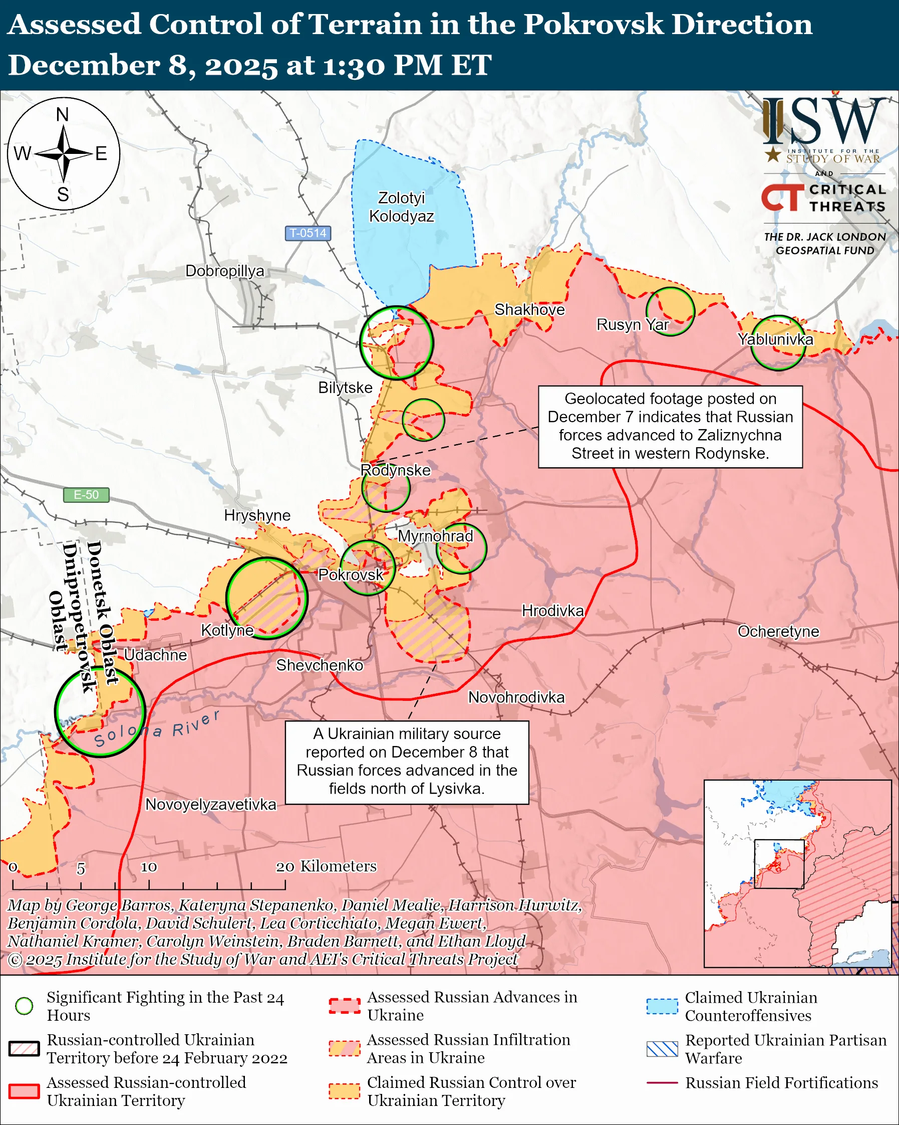 Нещодавно російські війська просунулися на Покровському напрямку. Геолокаційні матеріали від 7 грудня показують просування окупантів у північно-західній частині Родинського (північ від Покровська). Водночас, за даними ISW, населений пункт лишається спірним із частими змінами контролю. Інші кадри свідчать про рух ворога уздовж автомагістралі Т-0504 Покровськ – Мирноград у південно-західній частині Рівного (північний схід від Покровська).