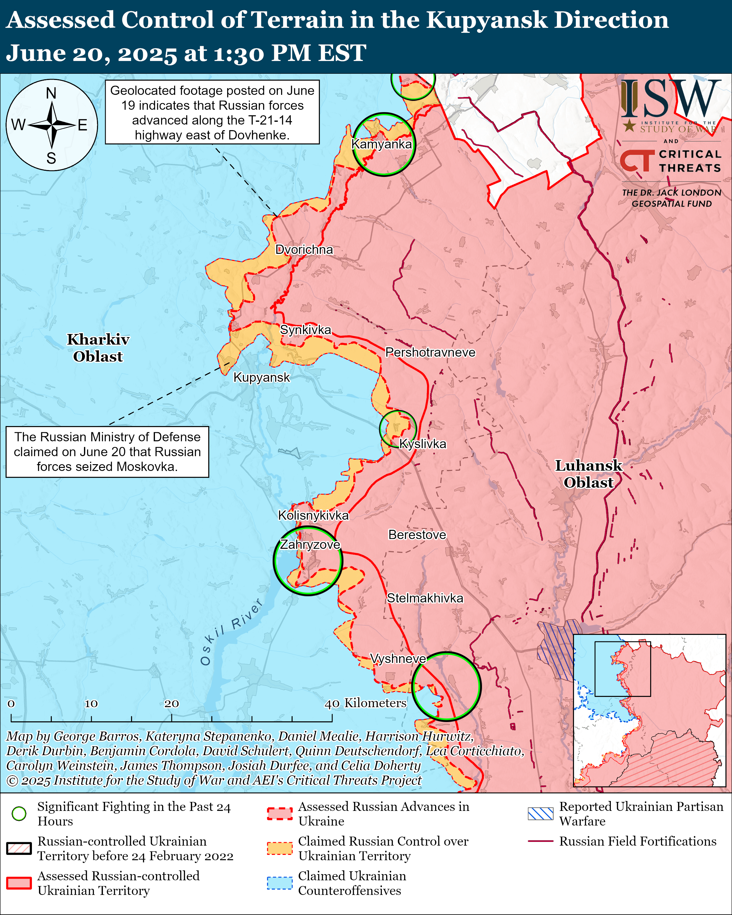 - Проте російські війська нещодавно просунулися на Куп'янському напрямку. Геолокаційні відеозаписи, опубліковані 19 червня, свідчать про те, що ворог просунувся на схід від Довгенького (на північний схід від Куп'янська).