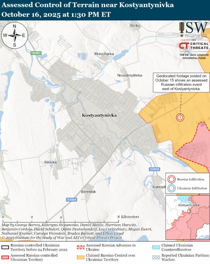 Важливо! Геолоковані відеозаписи, опубліковані 16 жовтня, вказують, що Сили оборони відбили російський механізований наступ у напрямку Володимирівки та Шахова (на північний захід від Володимирівки через річку Казенний Торець). Там було 22 одиниці бронетехніки, включаючи основну колону з 11 танків та бойових машин піхоти. OSINT-аналітики повідомляли, що ЗСУ знищили 9 одиниць бронетехніки та пошкодили 4. Це вже четвертий російський механізований наступ протягом одного місяця.