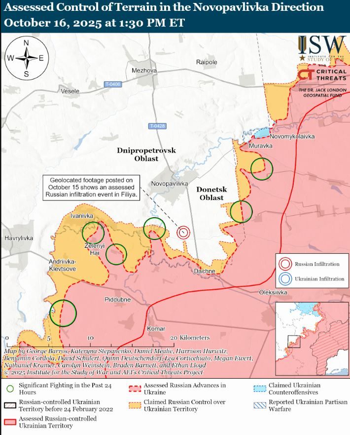 На геолокованих відеозаписах, опублікованих 15 жовтня, видно, що українські війська завдають удару по позиціях російських військ на схід від Філії, що, за оцінкою ISW, було російською місією інфільтрації. ISW оцінює, що ця подія не просунула передній край зони бойових дій (FEBA),