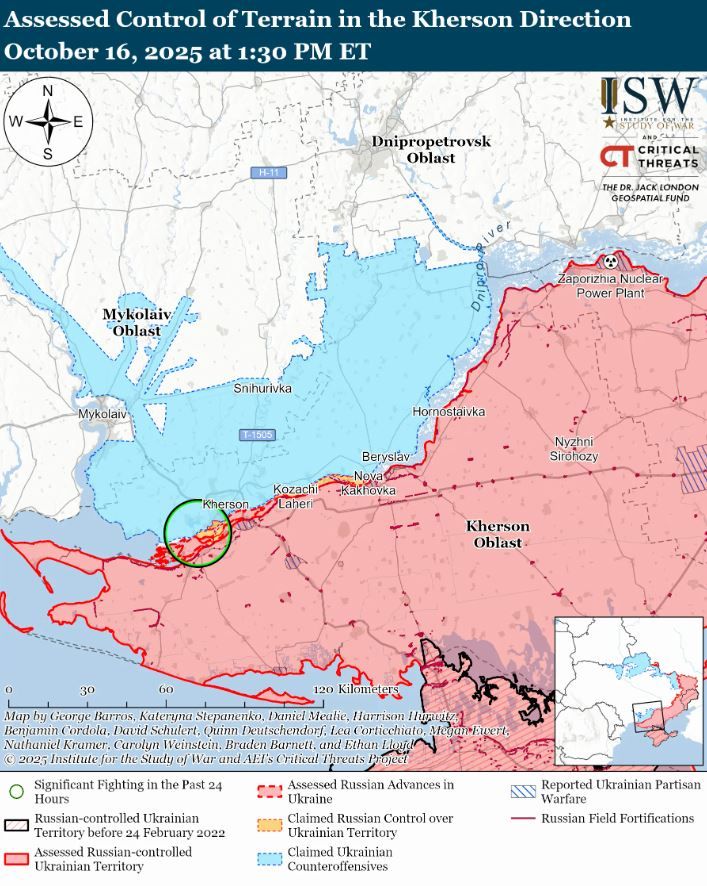 16 жовтня російські війська продовжували обмежені наступи на Херсонському напрямку, але підтвердженого прогресу не досягли.