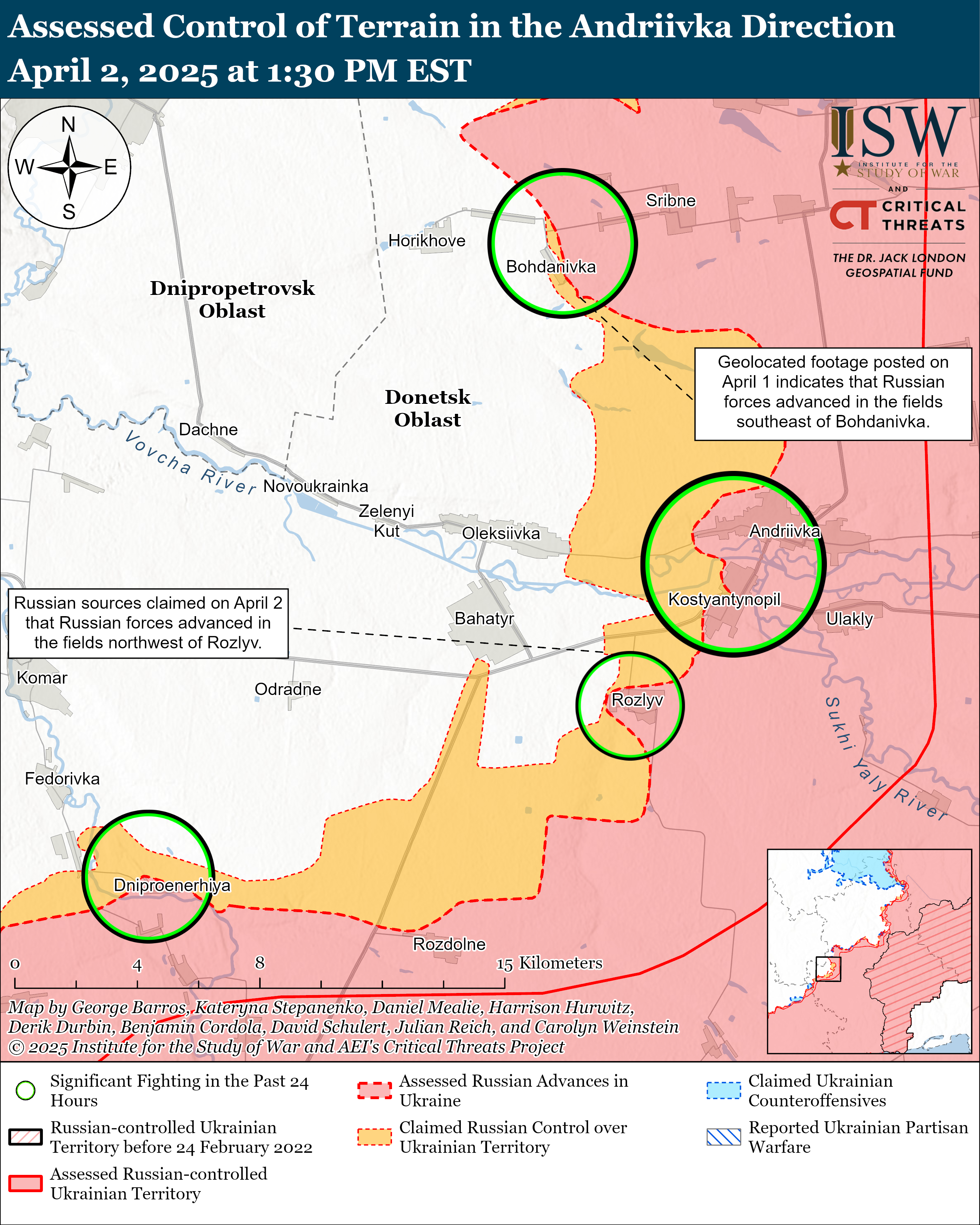 Російські війська провели наступальні операції на захід від Курахового біля Андріївки та Костянтинополя і на південний захід від Курахового біля Розливу 1 і 2 квітня.