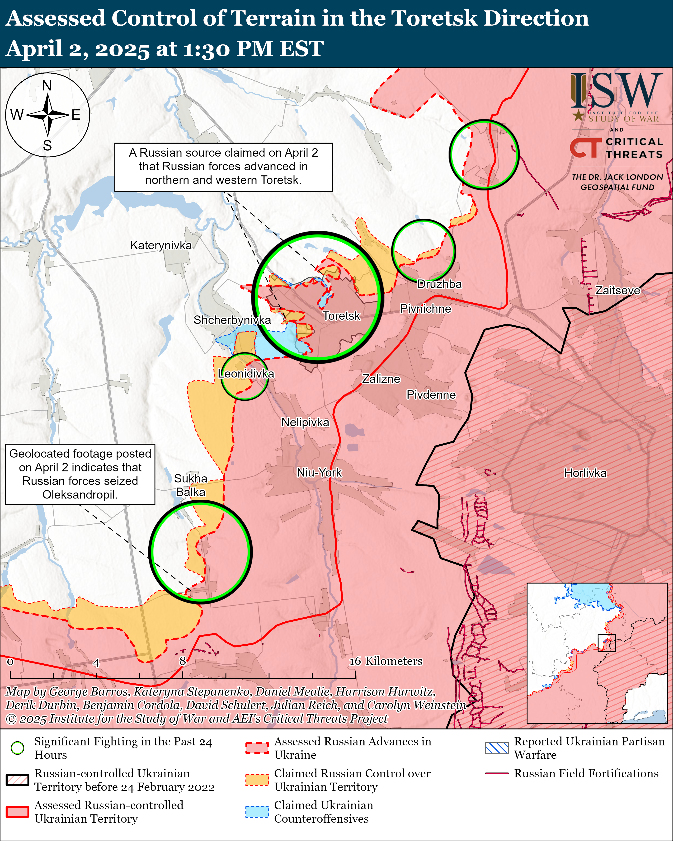 Можливо, росіяни захопили Олександропіль на південний захід від Торецька. Принаймні про це свідчить відео з геолокацією, де зображено підняття триколору. Російські війська атакували 1 та 2 квітня поблизу самого Торецька; на північ від Торецька біля Дачного та Диліївки; на схід від Торецька біля Кримського; на захід від Торецька біля Романівки, Щербинівки та Леонідівки; та на південний захід від Торецька біля Пантелеймонівки, Олександрополя, Валентинівки та Сухої Балки.