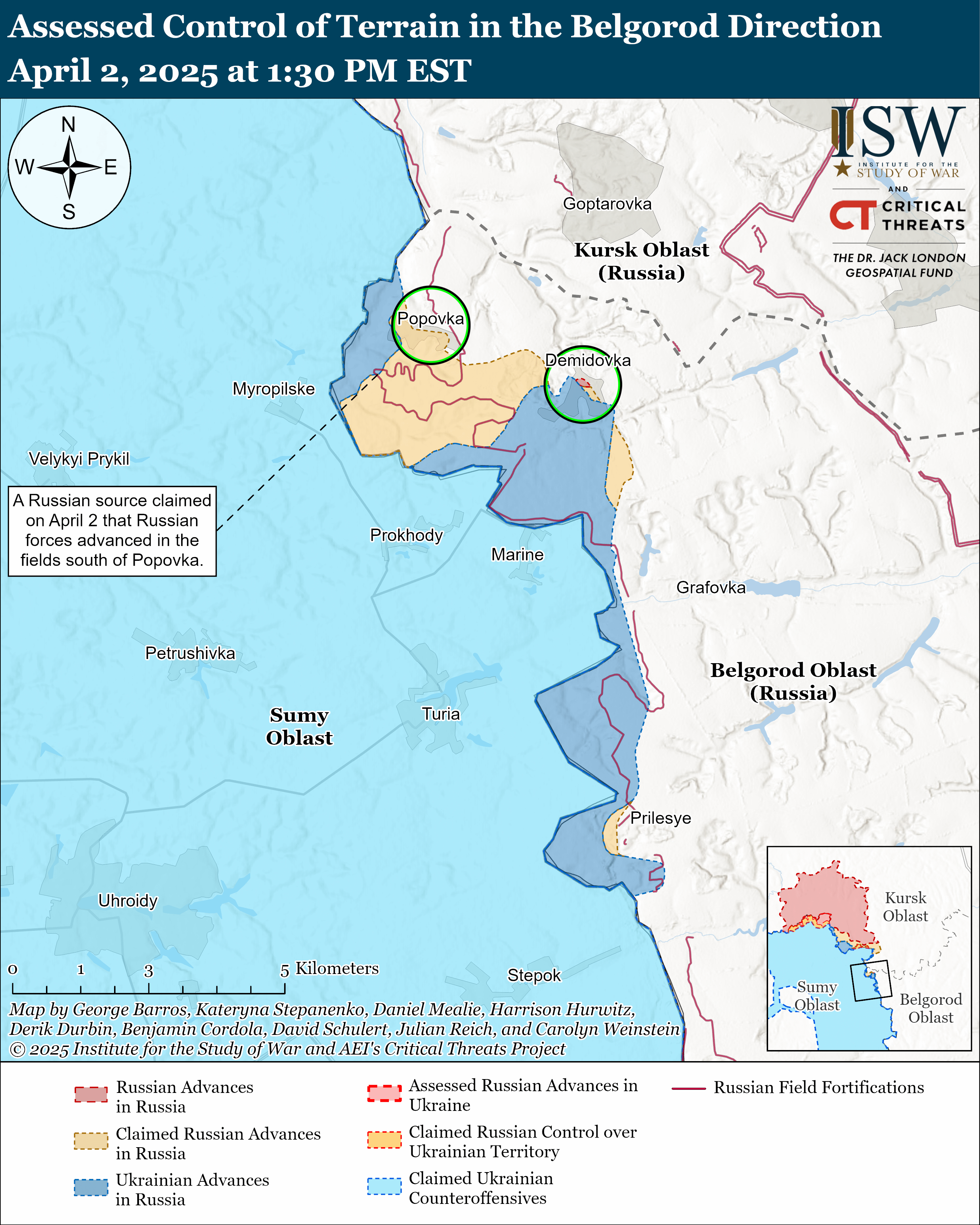 Геолокаційні кадри, опубліковані 2 квітня, вказують на те, що російські війська нещодавно захопили Лобкове (на північний захід від Роботиного) і просунулися на схід і захід від цього населеного пункту.