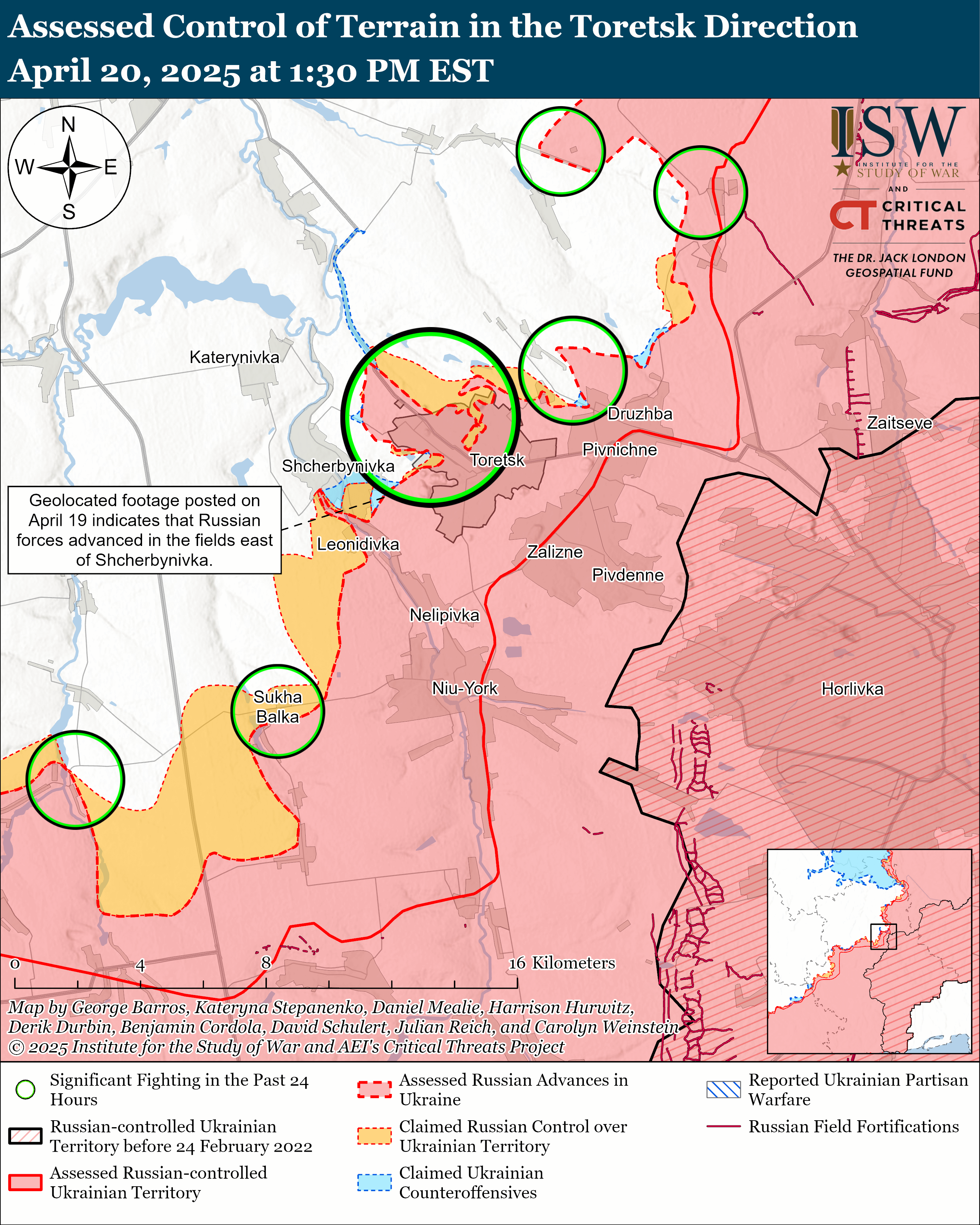 Геолокаційні кадри, опубліковані 19 квітня перед початком "великоднього перемир'я", вказують на те, що російські війська нещодавно просунулися на схід від Щербинівки (на захід від Торецька). У зведенні Генерального штабу України від 20 квітня о 16:00 зазначено, що російські війська порушили перемир'я, атакувавши поблизу Торецька, на схід від Торецька біля Дружби та на південний захід від Торецька біля Сухої Балки.