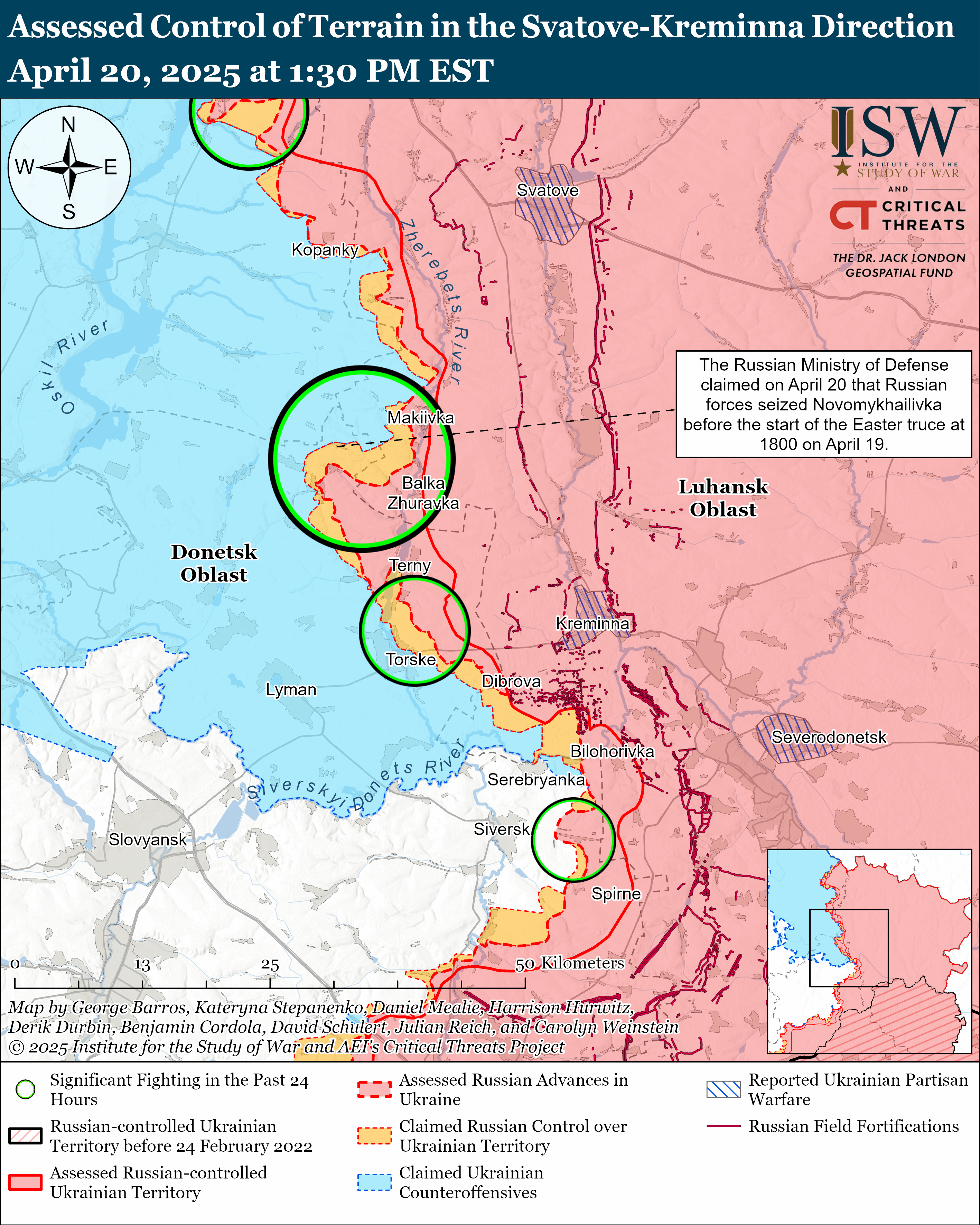 У Генштабі ЗСУ заявили: росіяни порушили перемир'я, атакувавши 20 квітня на північний схід від Лиману біля Мирного. Також окупанти використовують перемир'я для перегрупування, перекидання піхоти на передові позиції та спроб зачистити переправи через річку Жеребець.