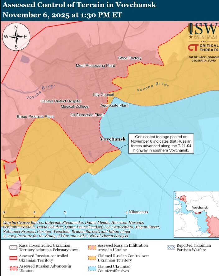 - на півночі Харківської області: геолокаційні відеозаписи, опубліковані 6 листопада, свідчать про незначне просування ворога в південній частині Вовчанська (на північний схід від Харкова);