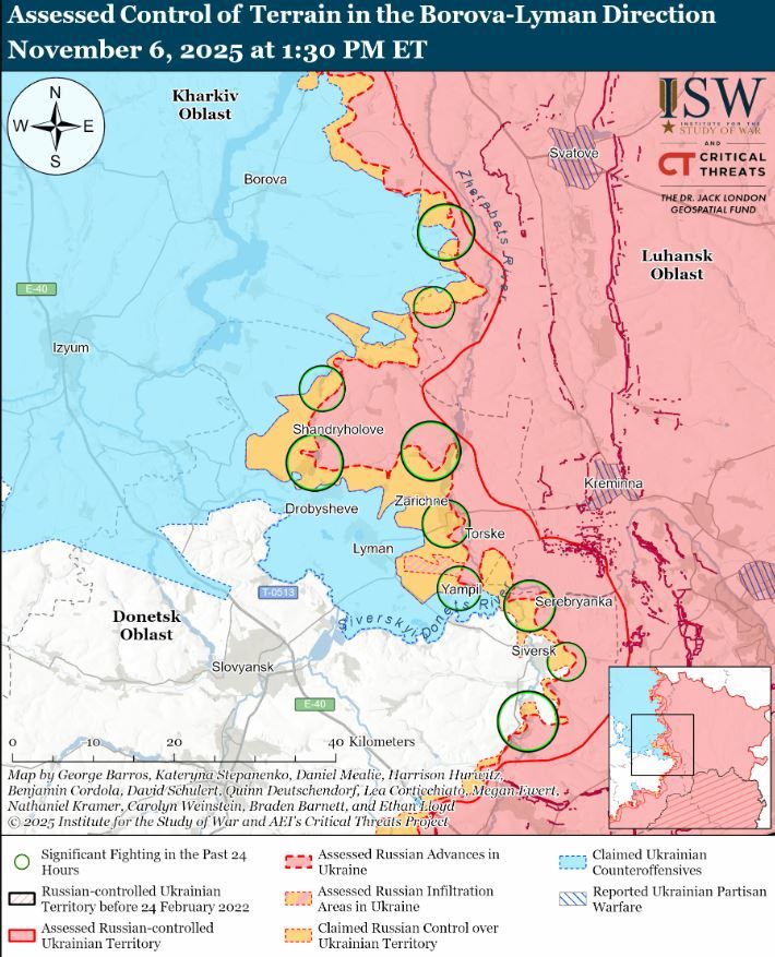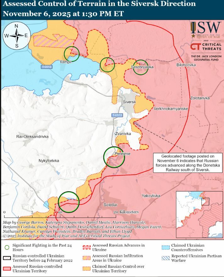 - на Сіверському напрямку: геолокаційні відеозаписи, опубліковані 6 листопада, свідчать про те, що російські війська нещодавно просунулися вздовж Донецької залізниці на південь від Сіверська;