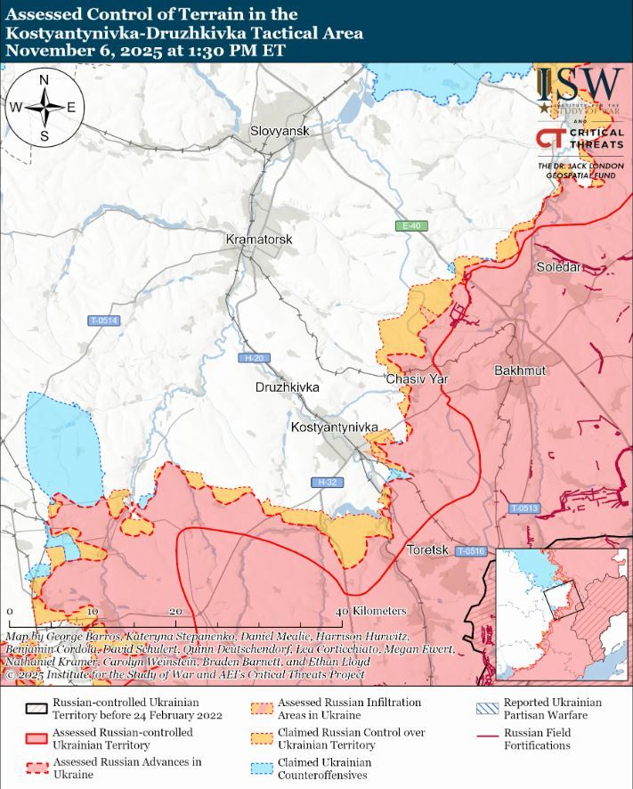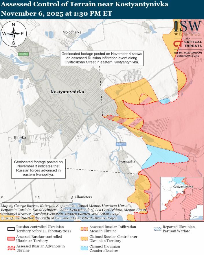 - в тактичному районі Костянтинівка – Дружківка: геолокаційні відеозаписи, опубліковані 3 листопада, свідчать про те, що російські війська нещодавно незначно просунулися у східному Іванопіллі (на південний схід від Костянтинівки).