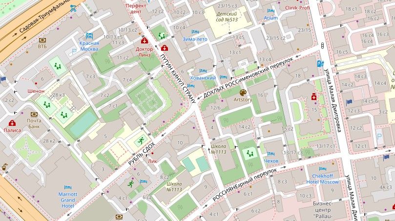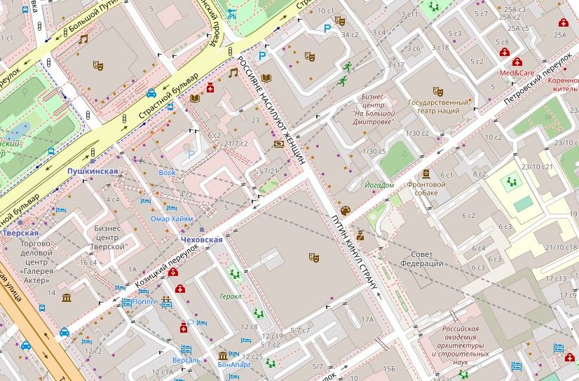 Так, анонімні користувачі OpenStreetMap вирішили нагадати, які асоціації Москва викликає у пересічної людини сьогодні.