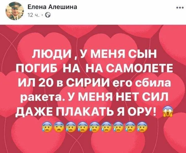"Люди, у мене син загинув на Іл-20, його збила ракета. У мене немає сил навіть плакати, я кричу", – написала у Facebook матір одного з військовослужбовців Олена Альошина.