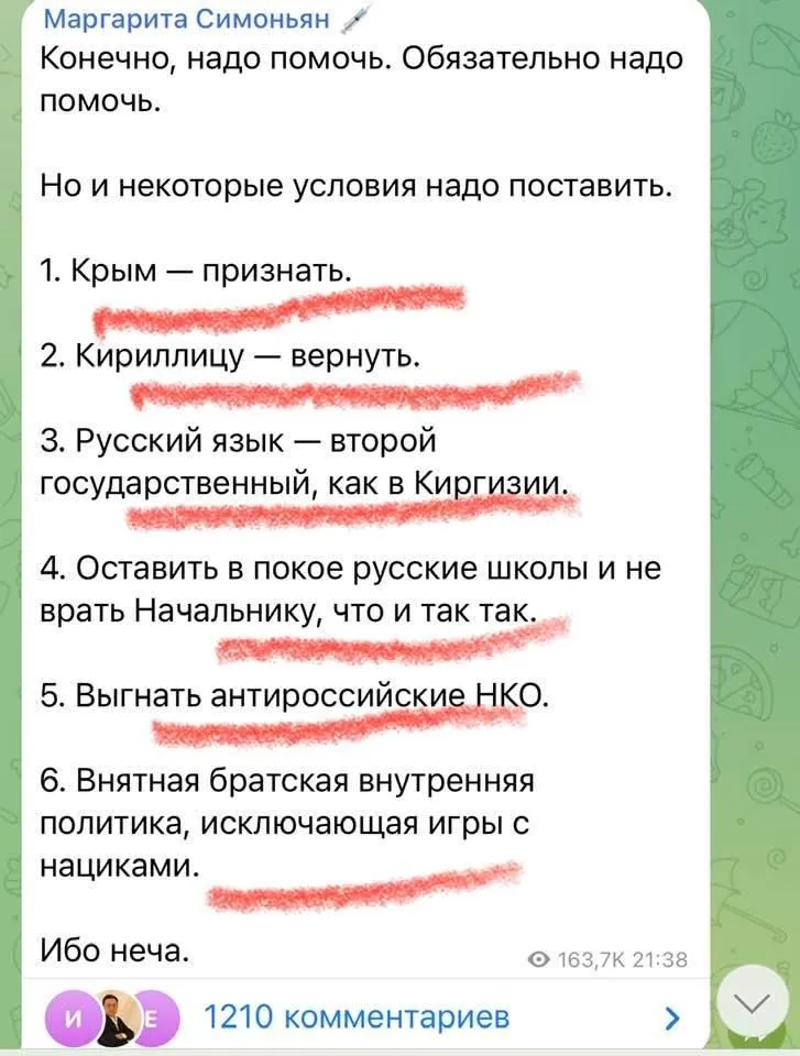 Спершу вимоги взялася висувати одна з найгучніших російських пропагандисток Маргарита Сімоньян.