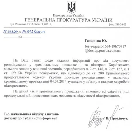 "Відповідно до ст. 280 Кримінального процесуального кодексу України досудове розслідування у вказаному кримінальному провадженні 04.07.2014 зупинено у зв'язку з тяжкою хворобою підозрюваного", — сказано у відповіді.