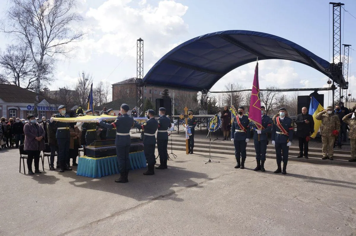 Біля будинку українського військового у Краснокутську, що на Харківщині, зібралися земляки, ветерани АТО/ООС, військовослужбовці Харківського гарнізону та бойові побратими загиблого, які приїхали з фронту.