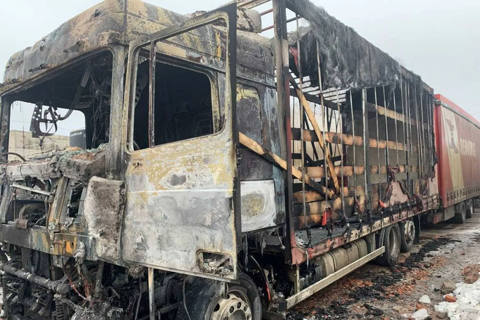 На місці надзвичайники виявили, що полум’я встигло поширитися по моторному відсіку та перекинулось на напівпричіп вантажівки. Загальна площа пожежі становила приблизно 20 квадратних метрів.