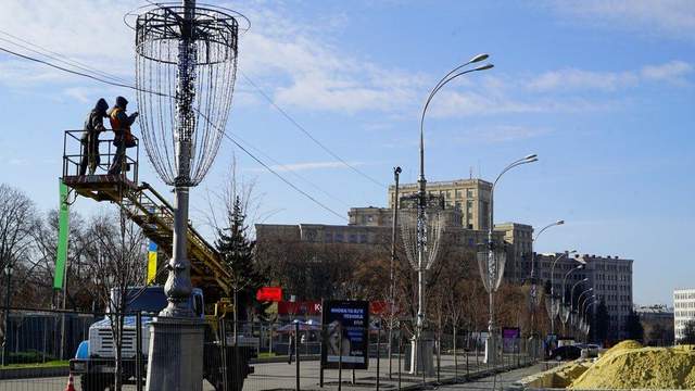 Також у місті почали встановлювати й новорічні декорації. Зокрема, в цей день їх помітили на ліхтарях у парку Горького.