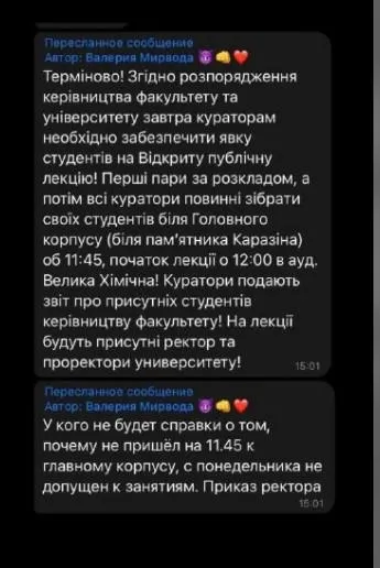 Це фейкова інформація. Ніхто не має права змушувати студентів йти на лекції… Університет іноді запрошує різних спікерів, і тоді ми інформуємо студентів про можливість їх відвідати, але нікого не примушують,