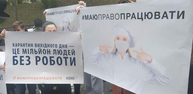 Під Кабміном зібрались сотні працівників ресторанів та кафе. Акцію назвали "Маю право працювати". "Нам не зрозуміло, чому уряд вважає, що на вихідних у коронавірусу вихідний, а у будні він оживає. Ми вийшли, що нас не закрили і ми мали нормальні зарплати", – сказала одна з учасниць протесту.