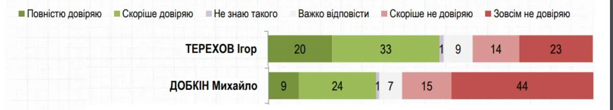 Сказали, що повністю довіряють Ігорю Терехову 20% опитаних, також 33% проголосували "скоріше довіряю". Висловили повну недовіру до його персони 23 відсотки опитаних.