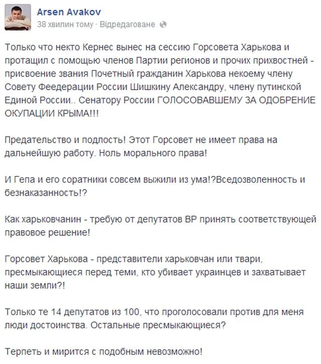Только что некий Кернес вынес на сессию горсовета Харькова и протянул с помощью членов "Партии регионов" и других прихвостней присвоение звания "Почетный гражданин Харькова" некоему члену Рады Федерации России Шишкину Александру, члену путинской "Единой России"... Сенатору России, который голосовал за принятие оккупации Крыма!